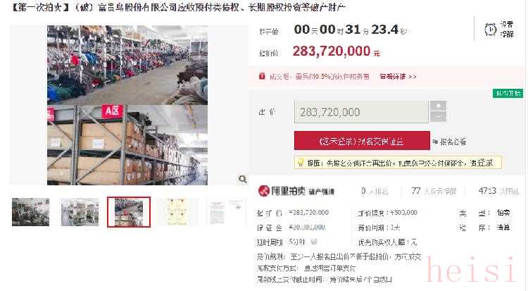 10月8日,阿里拍賣官網(wǎng)顯示,富貴鳥股份有限公司應(yīng)收預(yù)付類債權(quán)、長期股權(quán)投資等破產(chǎn)財產(chǎn)將于10月8日10時至10月9日10時期間進(jìn)行第一次拍賣。