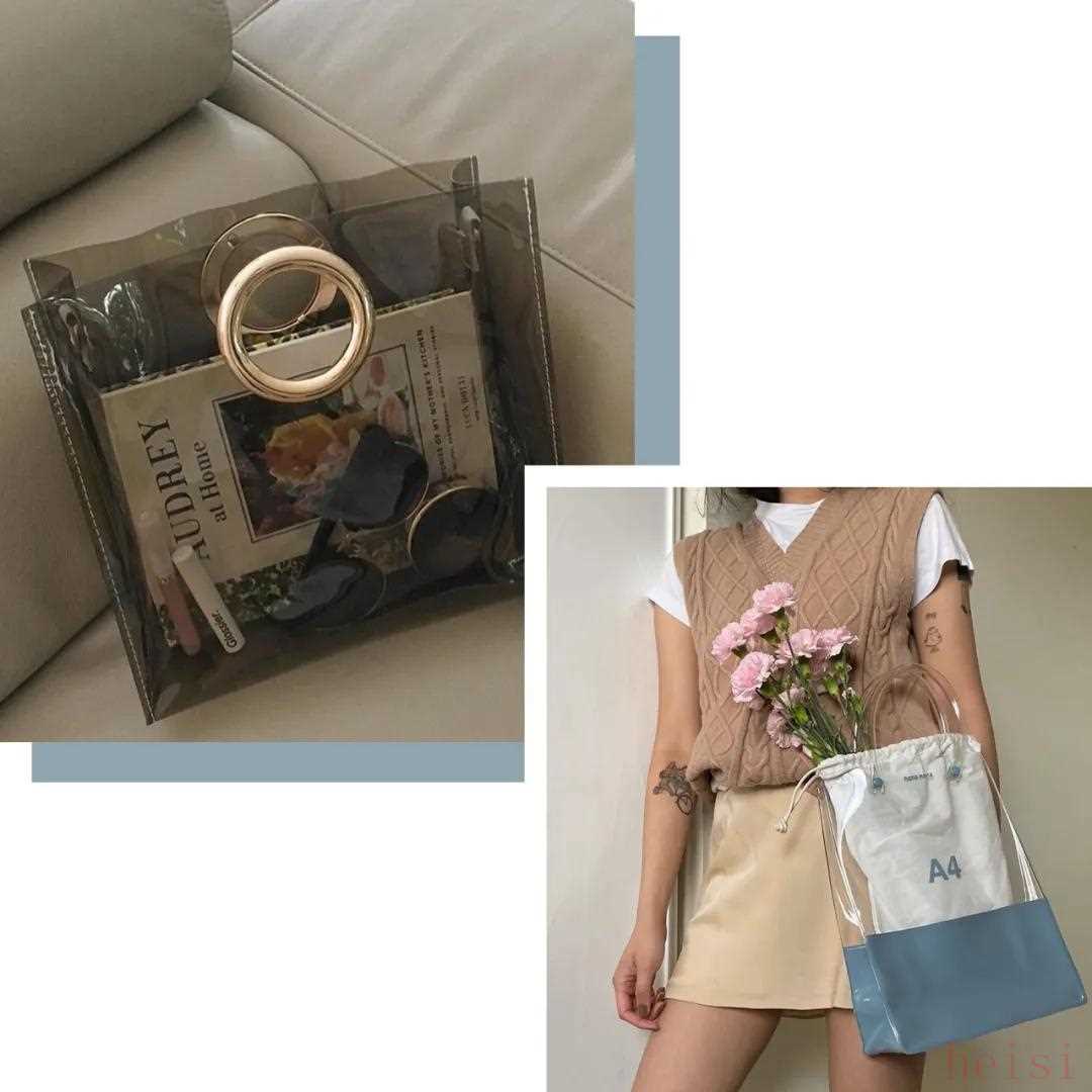或者可以在透明手包里疊放一只帆布包,讓整體搭配看起來更加別具一格不單調(diào)。