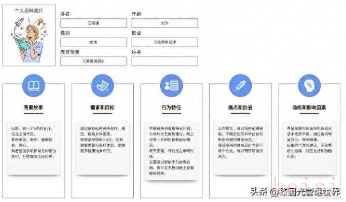 (3)客戶需求洞察。① 顯性需求:客戶直接表達的痛點,如性價比高、便捷;客戶雖未表達但是客觀存在必須滿足的需求,如食品安全、客戶安靜、干凈等;② 隱性需求:客戶表達模糊或沒有想到的需求,如吃好,這是一個模糊的表達方式,我不僅讓你吃好,還讓你吃出健康、吃出快樂,這是超出客戶期望的需求;還有情感或社會價值等尊重、愛、自我實現(xiàn)等需求,如身份認同、找到歸屬感、自我放飛等;(4)客戶畫像。創(chuàng)建典型客戶的虛擬形象,包含人口屬性、行為習慣、興趣愛好、“三觀”(世界觀、價值觀、生活觀)等,見圖1示例。