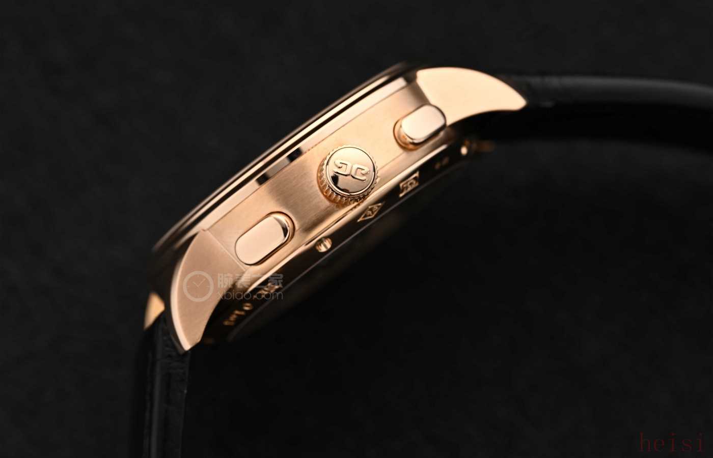 除了美學和工藝層面,這枚腕表在功能配置上也體現(xiàn)了務實和實用。最主要的功能是計時與飛返,飛返功能的存在,意味著在測量過程中不需要三步操作(停、歸零、再啟動),只需一次按鍵就能快速復位并重新啟動,適用于需要連續(xù)計時的場景。