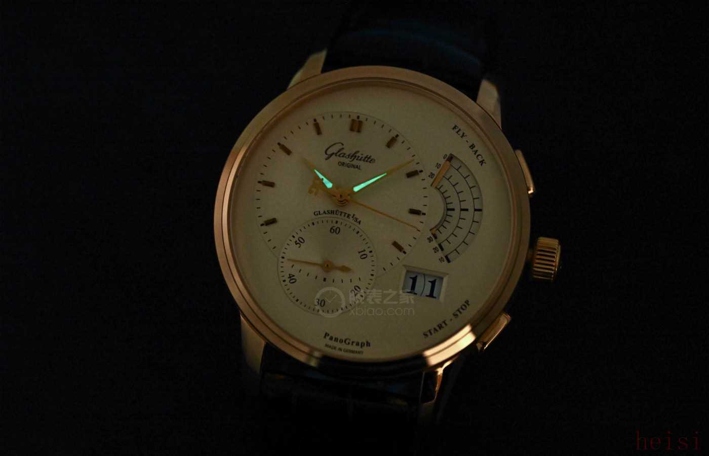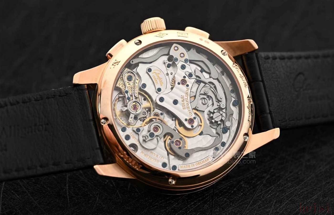 通過藍寶石水晶玻璃表背,可以清晰地看到格拉蘇蒂原創(chuàng)自制的61-03型手動計時機芯。這枚機芯的直徑為32.2毫米,厚度為7.2毫米,采用導柱輪結(jié)構(gòu),支持飛返功能,具備經(jīng)典的計時碼表機械結(jié)構(gòu)。振頻為每小時28,800次,可提供約42小時的續(xù)航時間。防水性能為50米。