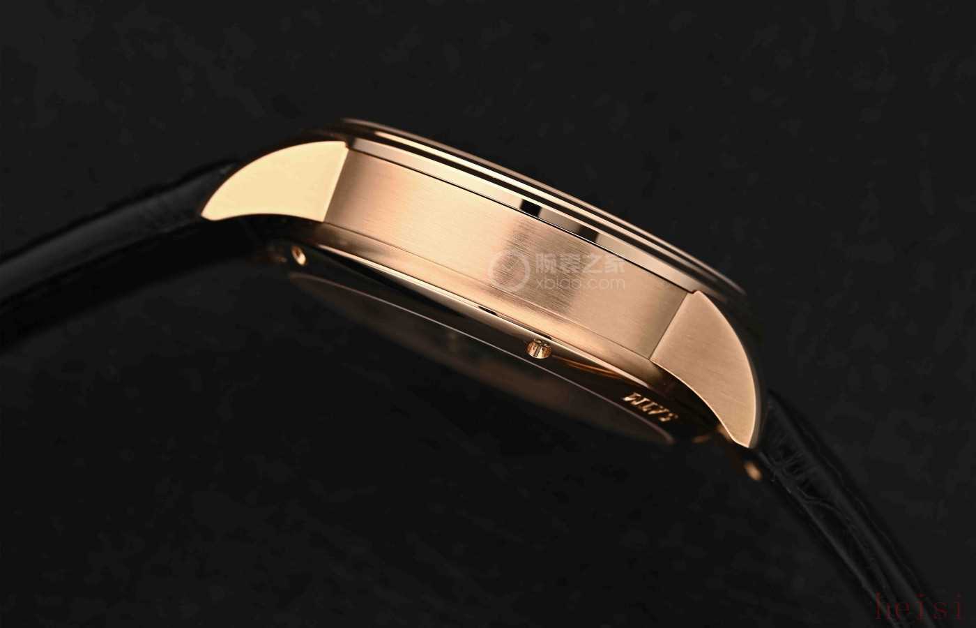 這枚腕表整體非常正式,且具有高級感。表殼采用18K紅金材質(zhì),表徑40毫米,厚度為13.7毫米,尺寸適中。紅金材質(zhì)經(jīng)過緞面磨砂和拋光雙重處理,在不同光線下呈現(xiàn)出細膩的光影變化。拋光表圈與拉絲殼體形成層次感,使得整枚腕表很有質(zhì)感,體現(xiàn)了高級制表應有的精度和工藝。腕表搭配的是黑色路易斯安那鱷魚皮表帶,屬于格拉蘇蒂原創(chuàng)一貫采用的高規(guī)格表帶選項,帶有細膩的紋理,質(zhì)地柔軟,針扣也是紅金材質(zhì),風格很統(tǒng)一。