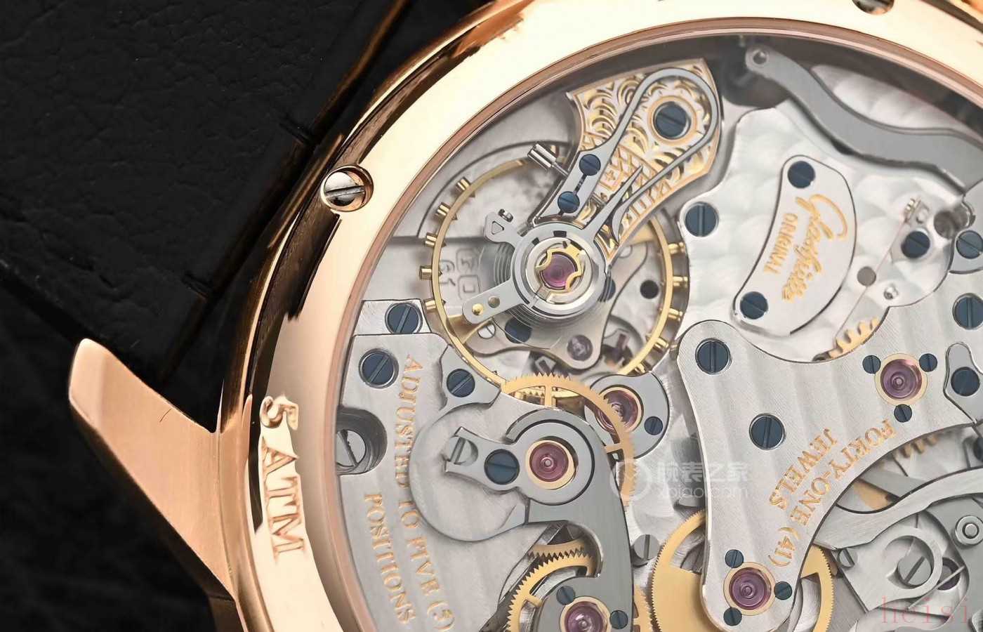 "偏心表體現(xiàn):" 偏心表將時針(或分針)置于表盤中央,而小時標圈則偏離中心。這種設(shè)計不僅在視覺上獨特,更在機械結(jié)構(gòu)上要求極高的平衡和補償。三問表更是如此,需要驅(qū)動報時機構(gòu)(打簧、敲擊)而不影響主計時間的精準,這背后是無數(shù)次的計算、試驗和微調(diào)。這種對“零誤差”的追求,正是德式嚴謹美學的核心。