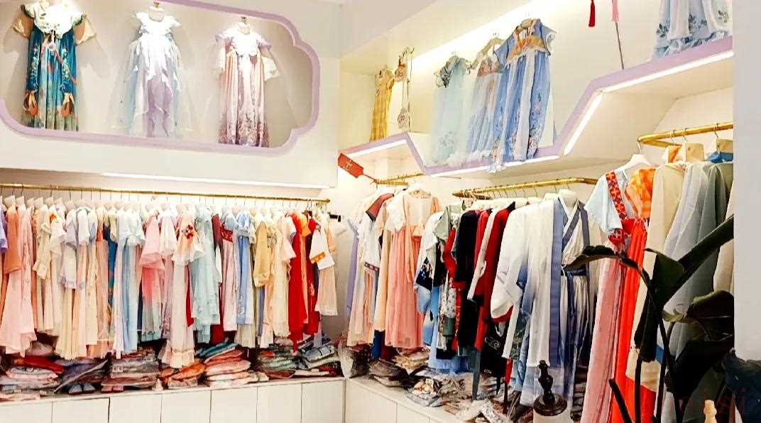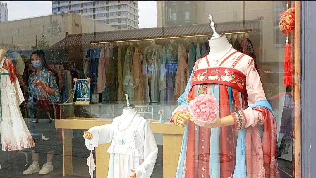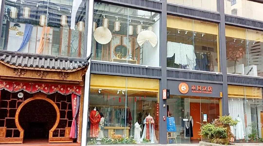 位于大成市場(chǎng)金、銀街,意外發(fā)現(xiàn)“池上錦”漢服一條街,透明的櫥窗里展示著各式精美漢服。松柏、帷幔、古色古香的漢唐川西建筑,像時(shí)空轉(zhuǎn)換,從喧囂的市井穿越到遠(yuǎn)古的文明。