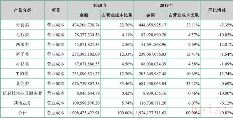 再具體到七匹狼支柱業(yè)務(wù)服裝的品類來看,七匹狼在2020年外套類、毛衫類、西服類、褲子類及襯衫類收入分別下滑18.87%、17.12%、25.97%、7.97%及15.79%至7.67億元、1.62億元、8434萬元、4.47億元及1.63億元。T恤成七匹狼2020年唯一增長品類,其銷售上升9.42%至4.79億元。