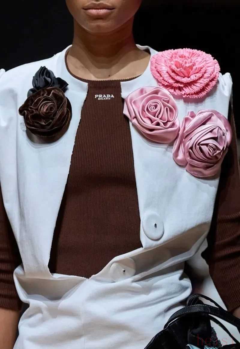 對(duì)花朵的熱愛蔓延到無數(shù)秀場,它的風(fēng)格絕不單一,Prada的花朵裝飾則是充滿文藝腔調(diào)的。