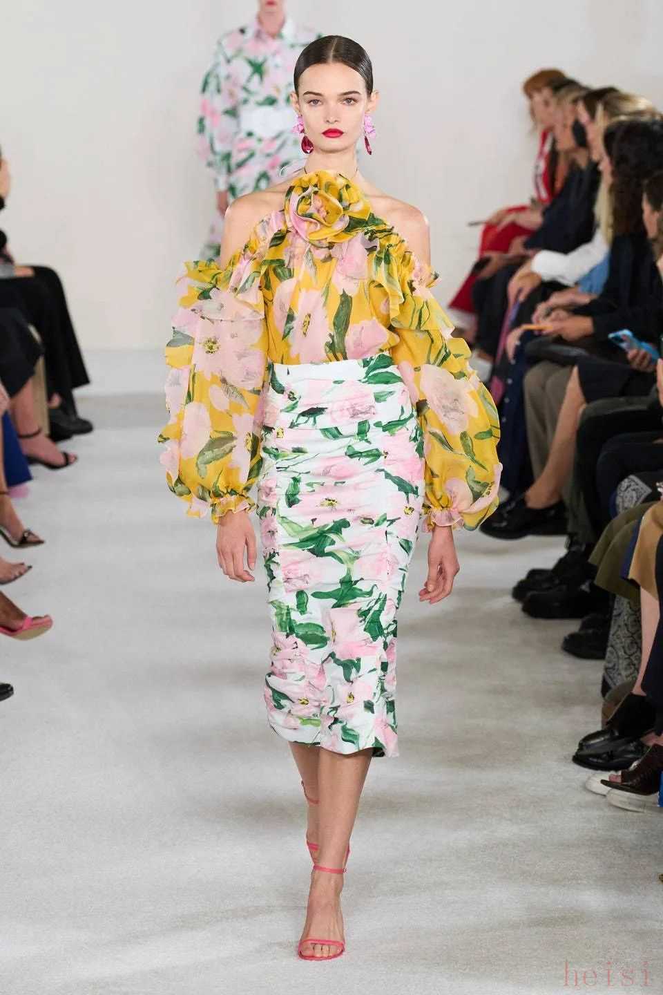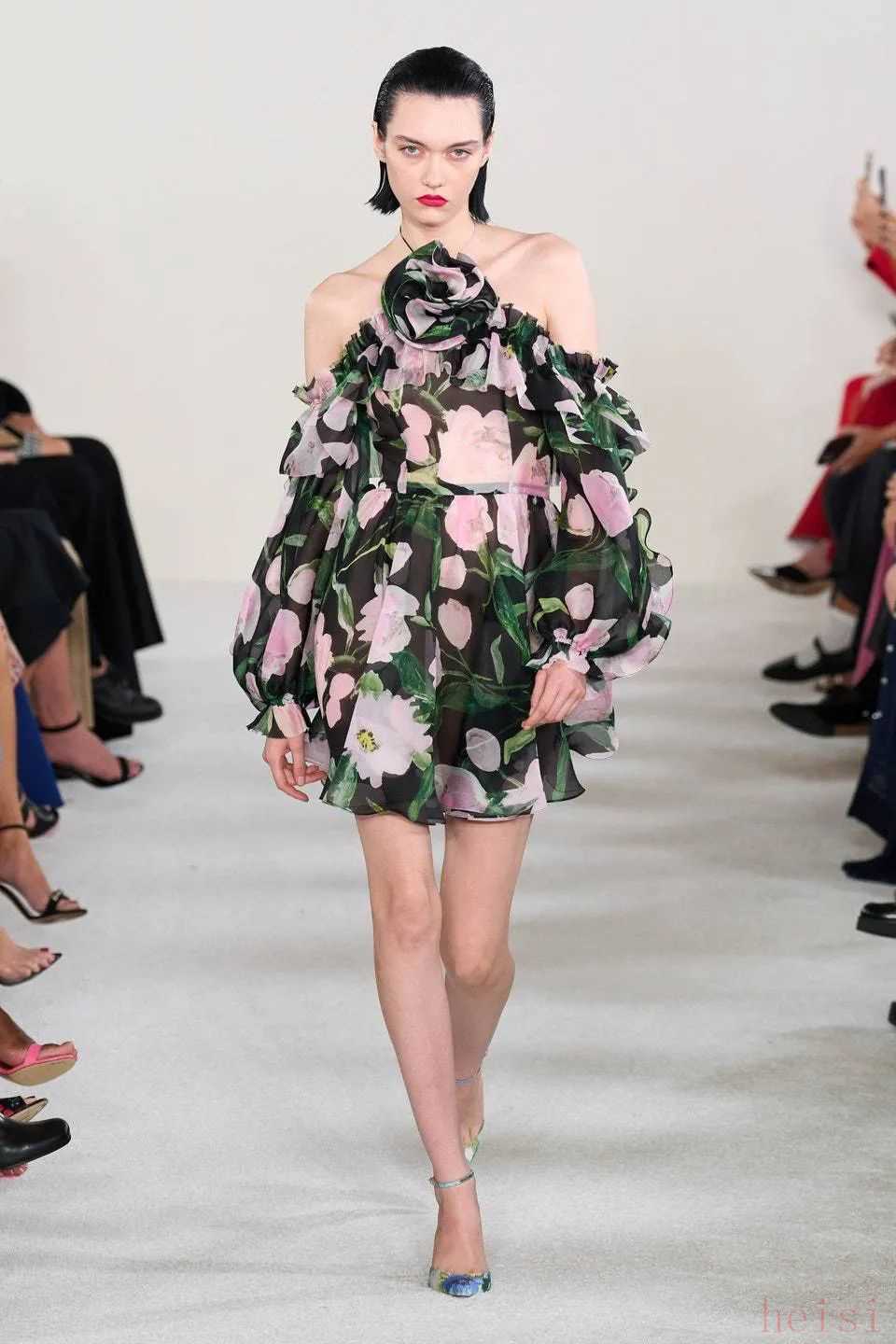 同樣把花朵裝飾在飄逸的裙裝上,Carolina Herrera用柔美的印花布料與立體花卉做結(jié)合,沒有巧奪天工的剪裁是萬萬做不出如此高級(jí)感的。