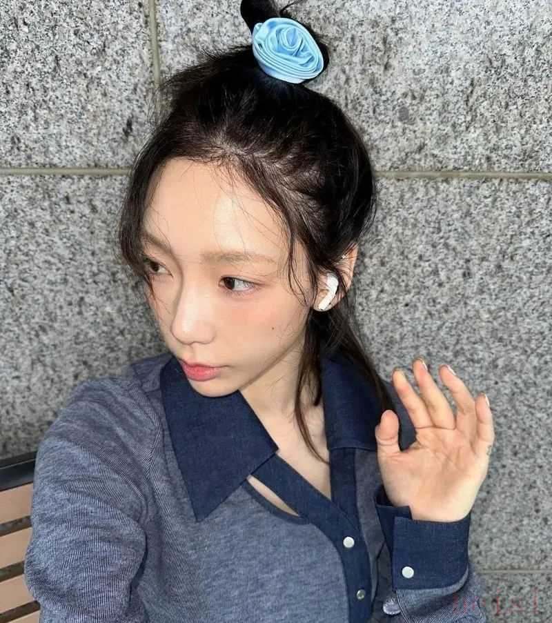 日常造型可供挑選的花朵頭飾也有很多種,泰妍的小藍(lán)花點(diǎn)綴日常造型剛剛好。