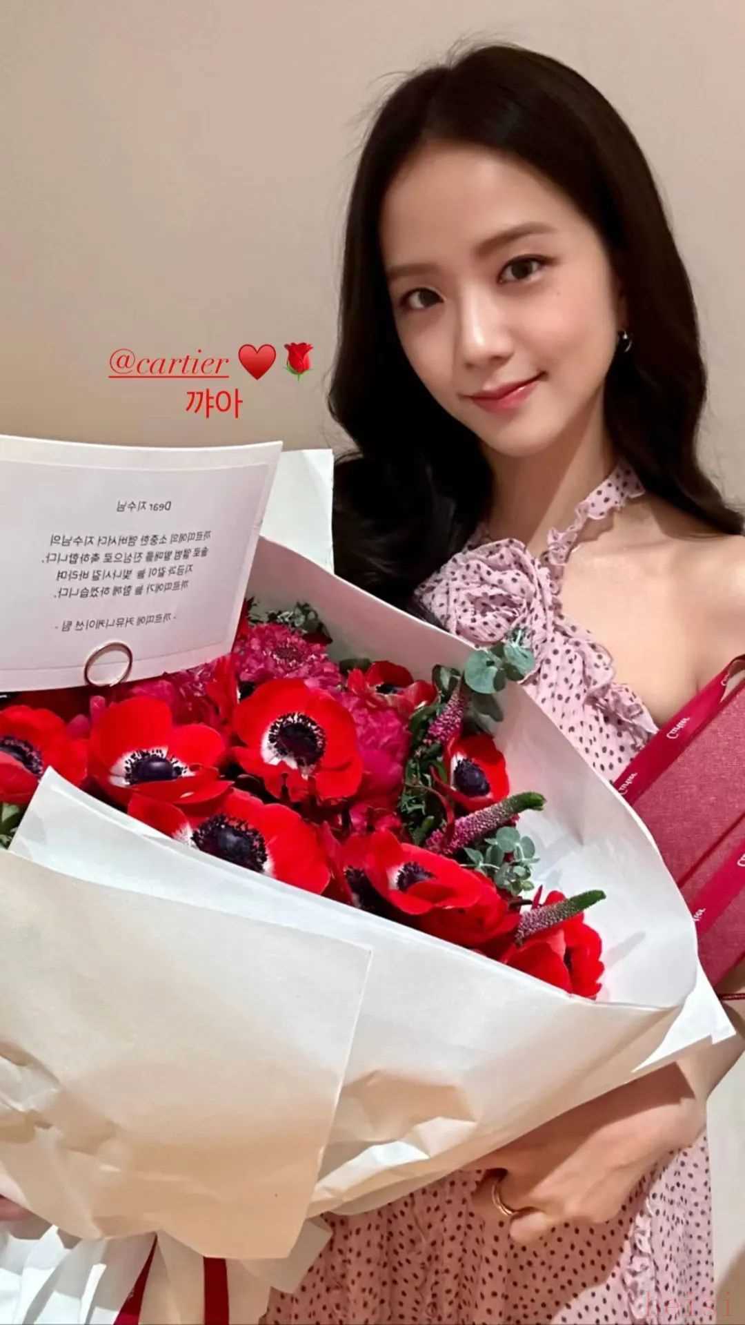 手心開花,衣服也要花朵盛開。Jisoo的粉色甜心look有了花朵加持,甜度加倍。