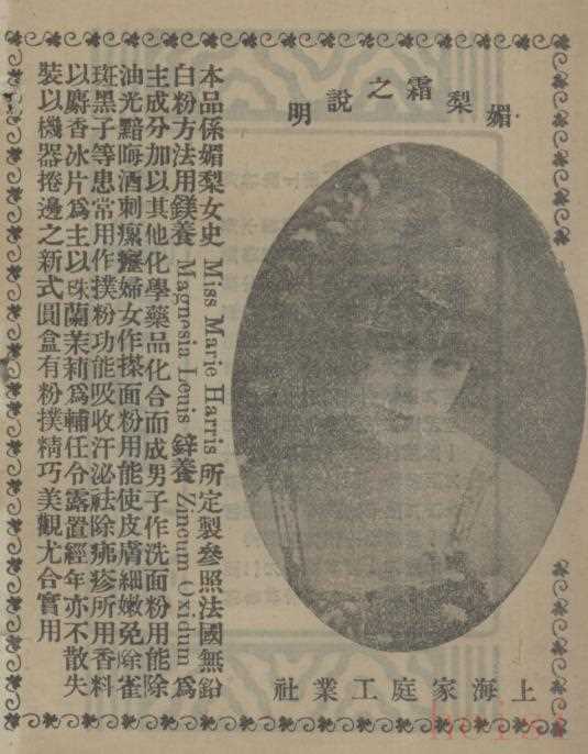 將我們的視線挪到周瘦鵑身上的,同樣是家庭工業(yè)社的一則廣告,不過(guò)與花露水無(wú)關(guān),而是一款名為“媚梨霜”的新產(chǎn)品(圖4)。這款產(chǎn)品其實(shí)就是爽身粉,還曾于首屆西湖博覽會(huì)之前,在杭州西湖邊的新市場(chǎng)陳列館寄售(《晶報(bào)》1924年5月3日)。產(chǎn)品據(jù)稱由媚梨女史Miss Marie Harris所定制,參照法國(guó)無(wú)鉛白粉方法,用鎂養(yǎng)、鋅養(yǎng)為主要成分,加以其他化學(xué)藥品化合而成。產(chǎn)品描述旁還附有一張相片,是一位低首含笑的西方年輕女子,這種圖文呈現(xiàn)方式,引導(dǎo)觀者將這位女子與Miss Marie Harris聯(lián)系起來(lái)。那么這位被稱為“媚梨”的女子Marie是否真實(shí)存在呢?之所以有這種疑惑,原因出在女子的名銜上。盡管Marie的確更常見(jiàn)于法國(guó)女性的命名(關(guān)于較為有名的例子,如路易十六的王后Marie Antoinette),可以說(shuō)是英文名Mary的法文翻版,呼應(yīng)文字提及的“法國(guó)無(wú)鉛白粉”,但是,Miss的說(shuō)法則是英文表述,法文的對(duì)應(yīng)表述應(yīng)為Mademoiselle,縮寫為Mlle,且Harris也并非典型的法國(guó)人姓氏。單從名銜來(lái)說(shuō),這個(gè)人物的真實(shí)性就要打一個(gè)問(wèn)號(hào)。加之Miss有未婚之意,如果其婚后冠以夫姓,又給人物追蹤增加了不小的難度。暫且拋開(kāi)這位女子的神秘身份不提,我們注意到,該影像的藝術(shù)加工形式后來(lái)出現(xiàn)在不少家庭工業(yè)社的“媚梨”產(chǎn)品中。圖1、2的花露水瓶身,因角度問(wèn)題,如果說(shuō)看起來(lái)不甚明顯,以下的例子則可以清楚地看到兩者的關(guān)聯(lián),圖5的兩款產(chǎn)品的瓶身正中與圖4的相片是同一造型的摩登女郎:波浪式的燙發(fā)、頷首淺笑的表情、露肩的吊帶,成為可量化生產(chǎn)的“媚梨”造型,目前在舊物市場(chǎng)仍能找到其蹤跡。