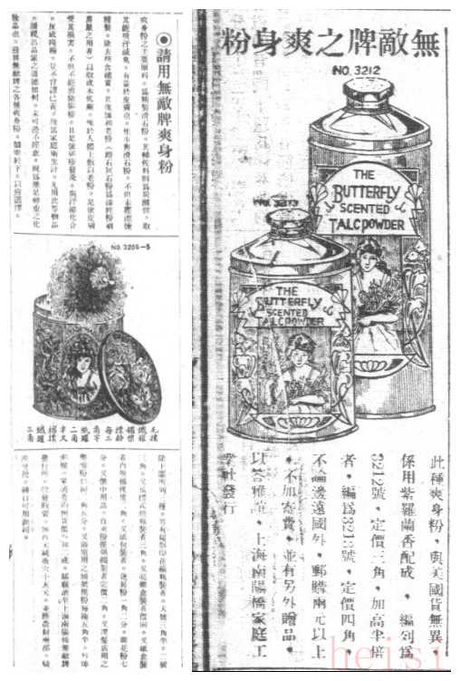 《紫羅蘭之優(yōu)待券》:瘦鵑生平,雅好紫羅蘭花,特囑天虛我生制成一種紫羅蘭之爽身粉,濃香艷美,無(wú)以復(fù)加,爰經(jīng)家庭工業(yè)社擔(dān)任發(fā)行,以公同好,裝用蓮蓬式之美術(shù)鐵瓶,上印Miss Marie Harris女史之七色照相,美麗絕倫,仍以蝴蝶為商標(biāo),定名為(無(wú)敵牌爽身粉)The “Butterfly” Scented Talc Powder。每瓶定價(jià)三角,如憑此券向購(gòu),祗收七折,實(shí)洋二角一分,大號(hào)瓶高六寸,定價(jià)四角,七折減收二角八分,郵費(fèi)另加,每單純費(fèi)二角,可寄六瓶或大號(hào)四瓶,如寄十二瓶或大號(hào)八瓶,祗需郵費(fèi)三角,惟邊遠(yuǎn)倍費(fèi)之處,照郵章加算。請(qǐng)與上海小西門新馬路家庭工業(yè)社或棋盤街著易堂購(gòu)取可也。(1923年7月18日)