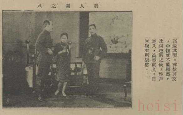 圖9 《美人關(guān)》劇照之一,展現(xiàn)高人杰、胡媚梨、尚劍帆的三角關(guān)系(圖片來(lái)源:《明星特刊》1928年第29期)