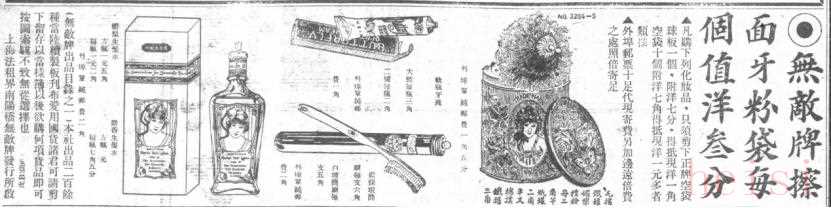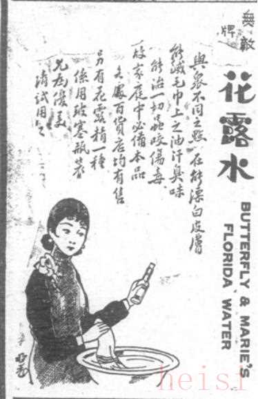 又為周瘦鵑的夫人胡鳳君特制紫羅蘭粉,因瘦鵑有紫蘭小筑,夫婦雙棲其間。該粉除贈(zèng)送瘦鵑外,也在市上暢銷。又制“無(wú)敵牌”花露水,當(dāng)杭州舉行西湖博覽會(huì),蝶仙動(dòng)了腦筋,特在會(huì)中裝一噴水泉,所噴的就是“無(wú)敵牌”花露水,香溢數(shù)里。這個(gè)廣告宣傳,做得多么巧妙啊!