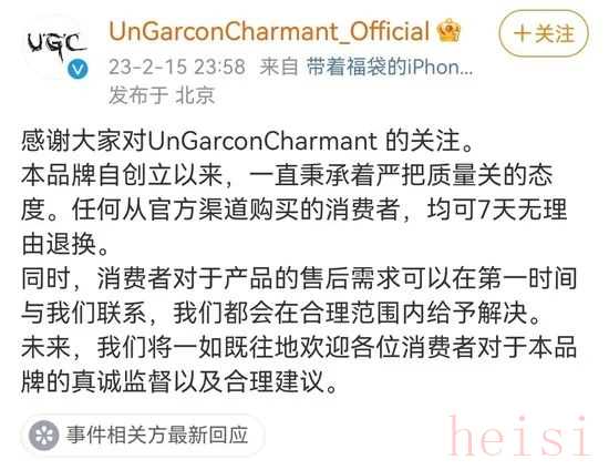 2023年2月15日晚,鹿晗潮牌U.G.C的官方賬號曾針對此事發(fā)布回應(yīng)聲明:“本品牌自創(chuàng)立以來,一直秉承著嚴(yán)把質(zhì)量關(guān)的態(tài)度。任何從官方渠道購買的消費者,均可7天無理由退換。同時,消費者對于產(chǎn)品的售后需求可以在第一時間與我們聯(lián)系,我們都會在合理范圍內(nèi)給予解決!”