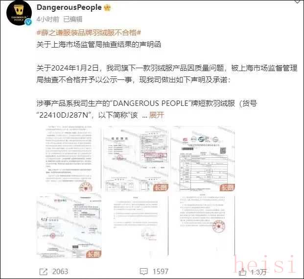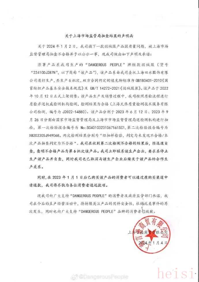 1月4日晚上,“DangerousPeople”通過其官方微博作出聲明稱,產(chǎn)品系委托上海田水服飾有限公司進(jìn)行生產(chǎn),共生產(chǎn)6批次。在收到第二次檢測不合格的結(jié)果后,經(jīng)自查確認(rèn)不合格產(chǎn)品為第6批次。公司立即聯(lián)系該生產(chǎn)企業(yè),要求其停止生產(chǎn)該產(chǎn)品并自查,同時也已取消與該生產(chǎn)企業(yè)后續(xù)關(guān)于該產(chǎn)品的合作生產(chǎn)關(guān)系。