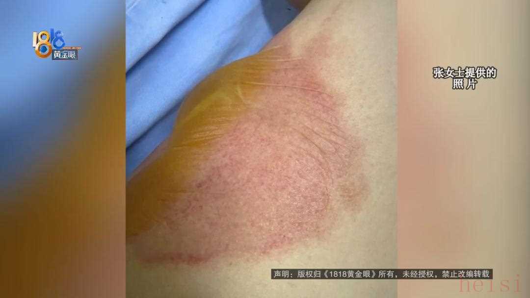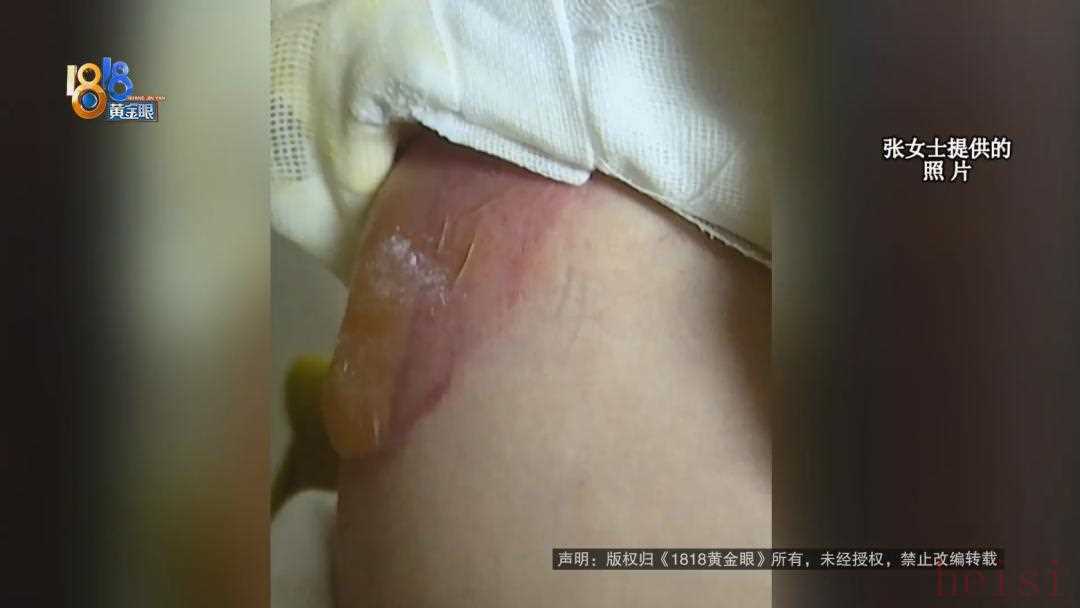 張女士:12月3號(hào),我從廚房里面,把這個(gè)熱水灌進(jìn)去,當(dāng)時(shí)這個(gè)外面,是套著這個(gè)袋子的,我一坐下,它就突然之間裂開(kāi),就在我這個(gè)大腿上面,然后我第一感覺(jué),馬上把左腿撇開(kāi),趕緊起來(lái),起來(lái)之后,就去看,當(dāng)時(shí)就已經(jīng)燙得比較嚴(yán)重了。