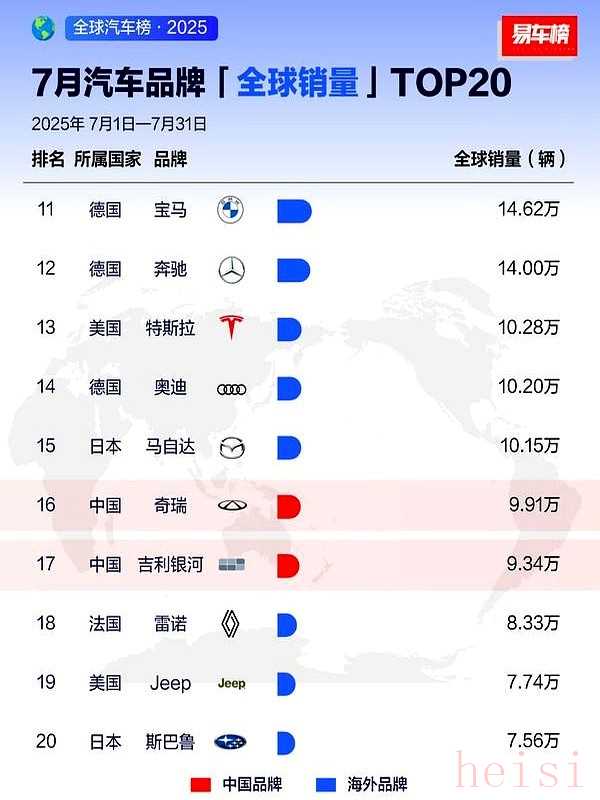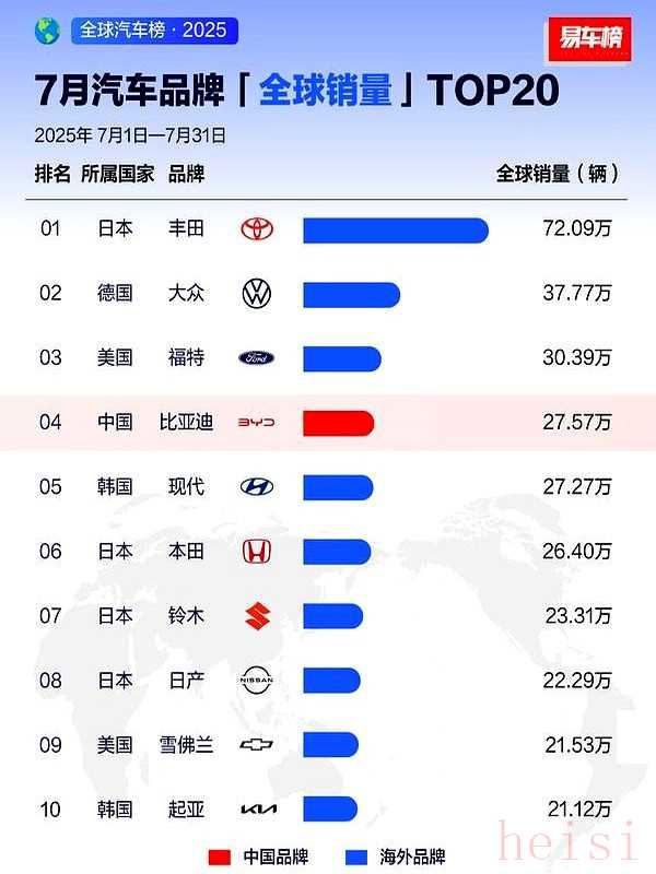 關(guān)于7月全球汽車(chē)品牌銷(xiāo)量排名,以及中國(guó)品牌是否即將殺入前三的問(wèn)題,根據(jù)目前公開(kāi)可查的信息和行業(yè)分析,情況如下: