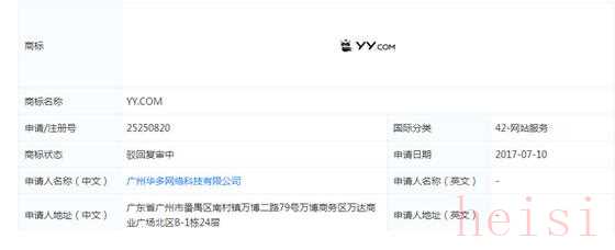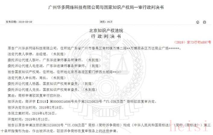 中國(guó)裁判文書網(wǎng)2019年10月9日公布的北京知識(shí)產(chǎn)權(quán)法院一審行政判決書((2019)京73行初4899號(hào))顯示,被告國(guó)家知識(shí)產(chǎn)權(quán)局以原告廣州華多網(wǎng)絡(luò)科技有限公司申請(qǐng)注冊(cè)的第25236768號(hào)“YY.COM及圖”商標(biāo)構(gòu)成《中華人民共和國(guó)商標(biāo)法》第三十條所指情形為由,作出被訴決定,駁回訴爭(zhēng)商標(biāo)在復(fù)審商品上的注冊(cè)申請(qǐng)。原告請(qǐng)求法院撤銷被訴決定,責(zé)令被告重新作出決定。