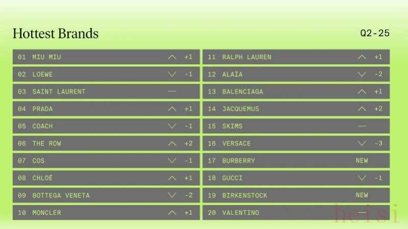 據(jù)時尚搜索引擎Lyst發(fā)布的2025年第二季度品牌熱度榜單顯示,Miu Miu上升一位,重回榜首,取代跌至第二位的Loewe。Saint Laurent繼續(xù)穩(wěn)居第三,隨后依次為Prada(+1)、Coach(-1)、The Row(+2)、COS(-1)、Chloé(+1)、Bottega Veneta(-2) 和 Moncler(+1)。值得注意的是,本季度“最熱門單品”前十名中有六款為鞋履,這也是自2018年該榜單創(chuàng)立以來,首次沒有包袋上榜。The Row售價690美元的人字拖位列最熱單品榜首。