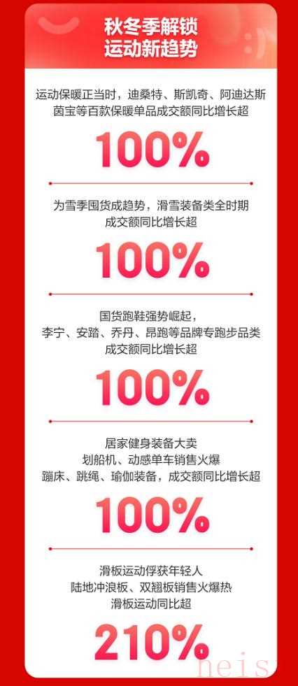 隨著秋季露營(yíng)、騎行、陸沖等活動(dòng)的流行,越來越多的年輕人開始參與其中,熱度急速飆升的新興潮酷運(yùn)動(dòng)爆發(fā)式增長(zhǎng)。陸地沖浪板品牌CARVER成交額同比增長(zhǎng)40倍,成為本次11.11中的“黑馬型”爆款品類;此外,眾多人氣戶外運(yùn)動(dòng)品牌產(chǎn)品均取得了銷售新高,牧高笛成交額同比增長(zhǎng)超去年2倍,挪客成交額同比增長(zhǎng)超去年3倍,迪桑特、亞瑟士、匡威成交額同比超去年2倍,美津濃開門紅前1小時(shí),成交額超去年開門紅28小時(shí),必邁成交額同比增長(zhǎng)200%,華為智選成交額同比增長(zhǎng)200%,其中華為智選智能跳繩,成交增長(zhǎng)超去年4倍,成為智能跳繩類目TOP1;捷瑞特JOROTO成交額,同比增長(zhǎng)超去年4倍。逐漸寒冷的天氣然球類運(yùn)動(dòng)裝備逆勢(shì)而上,室內(nèi)以球會(huì)友再掀冬季運(yùn)動(dòng)風(fēng)潮,李寧羽毛球裝備成交額同比增長(zhǎng)超100%。