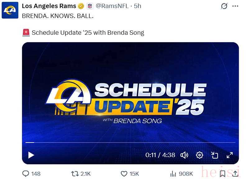 今天早些時(shí)候,NFL各支球隊(duì)都發(fā)布了新賽季賽程。其中,中國(guó)球迷比較熟悉的洛杉磯公羊,就請(qǐng)來了演員布蘭達(dá)·宋,化身新聞主播,邊播報(bào)邊整活,把對(duì)手逐一拉出來「調(diào)侃」了一遍。