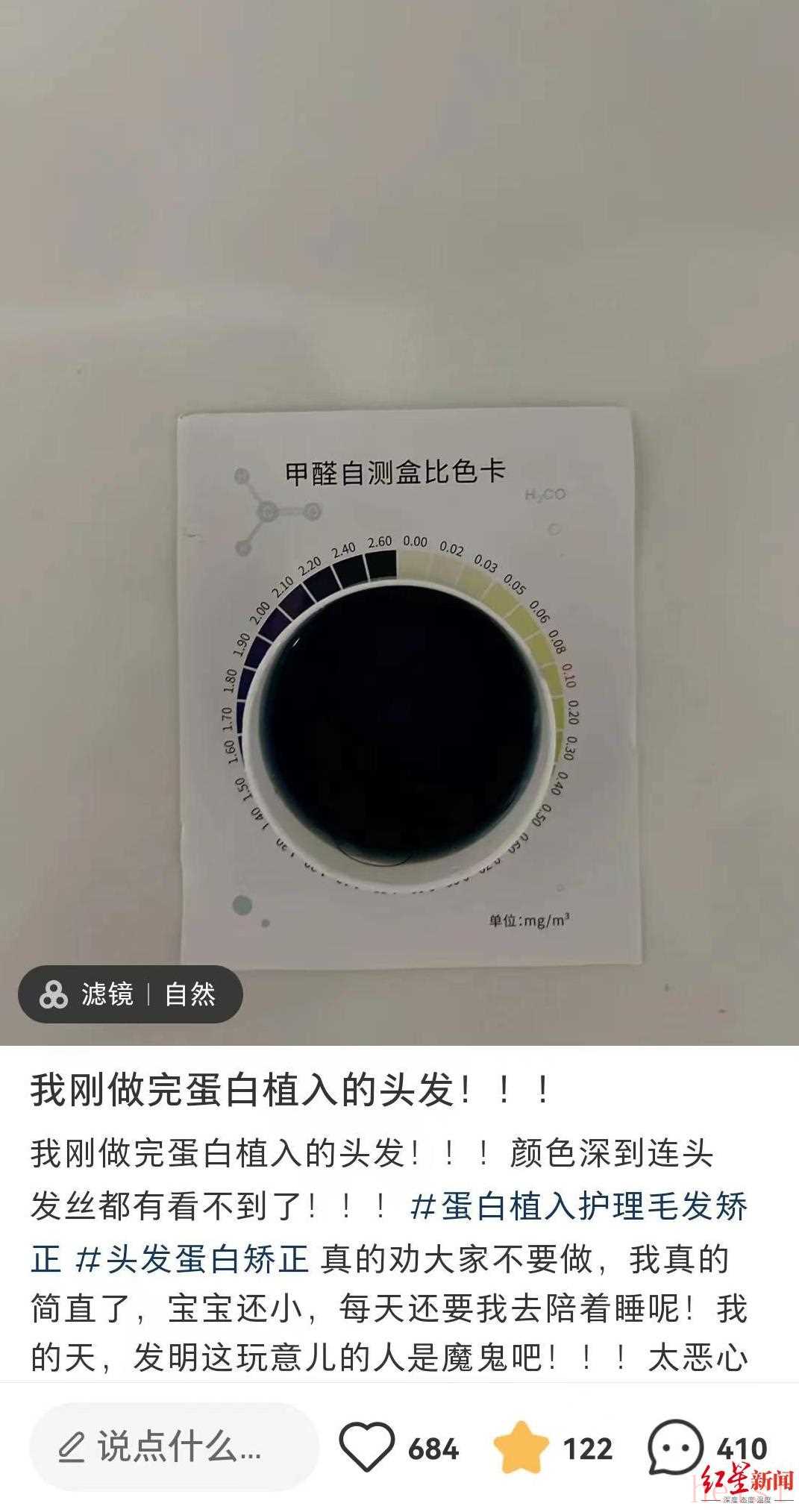 網(wǎng)友做完“蛋白矯正”后自測(cè)頭發(fā)絲甲醛含量