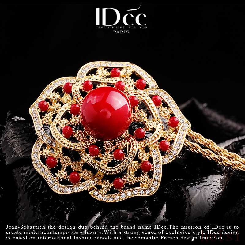 2. "設(shè)計(jì)元素:" "金色花朵胸針" - 這是項(xiàng)鏈的核心亮點(diǎn)。花朵造型通常象征美麗、浪漫、自然,金色則帶來(lái)溫暖、奢華和高級(jí)感。"胸針"形態(tài)可能指: