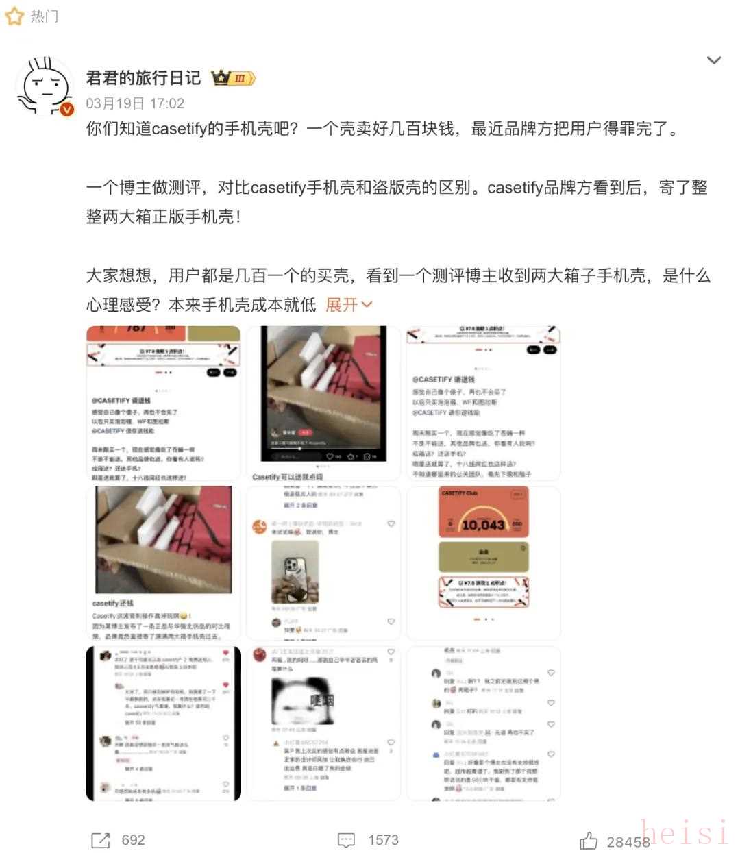 3月19日晚,#casetify手機殼 背刺#被沖上熱搜,巨大的輿論壓力下,博主已經(jīng)刪除了關(guān)于品牌方贈送手機殼的視頻,但測評視頻依舊保留。