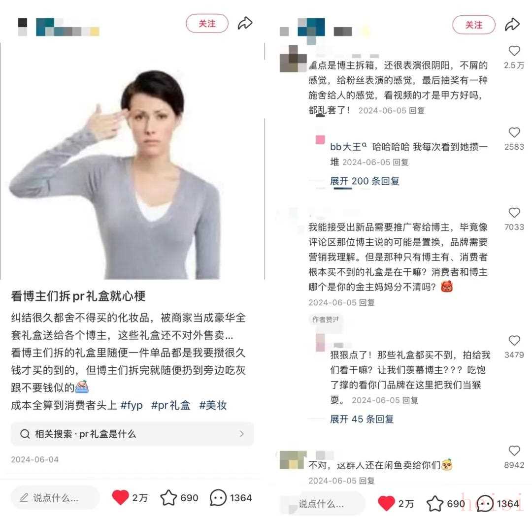 這背后還有一個行業(yè)變化,是越來越多消費者開始對品牌方批量給博主寄禮盒感到不滿,認為成本最終是算在了自己身上,社交平臺上有大量“看到博主們拆pr禮盒就心?!钡耐虏圪N。