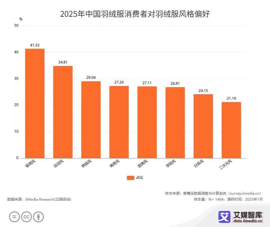 近年來(lái),沖鋒衣憑借防風(fēng)防水、輕量化設(shè)計(jì)及高性?xún)r(jià)比,成為羽絨服的“勁敵”。iiMedia Research(艾媒咨詢(xún))調(diào)研數(shù)據(jù)顯示,消費(fèi)者對(duì)羽絨服風(fēng)格的偏好更傾向于極簡(jiǎn)風(fēng)(41.33%)與運(yùn)動(dòng)風(fēng)(34.81%),反映出消費(fèi)者對(duì)“簡(jiǎn)約設(shè)計(jì)+實(shí)用功能”的雙重追求。其中,極簡(jiǎn)風(fēng)強(qiáng)調(diào)剪裁利落、色彩中性(如米白、深灰),適配通勤與日常場(chǎng)景;運(yùn)動(dòng)風(fēng)則注重輕量化與防風(fēng)防水性能,契合滑雪、徒步等戶(hù)外活動(dòng)需求。企鵝羽絨服的戶(hù)外羽絨服精準(zhǔn)對(duì)標(biāo)這兩大趨勢(shì)——采用防潑水面料與立體充絨工藝制成沖鋒衣面料,既滿(mǎn)足都市白領(lǐng)的極簡(jiǎn)審美,又適配戶(hù)外愛(ài)好者的功能性需求。