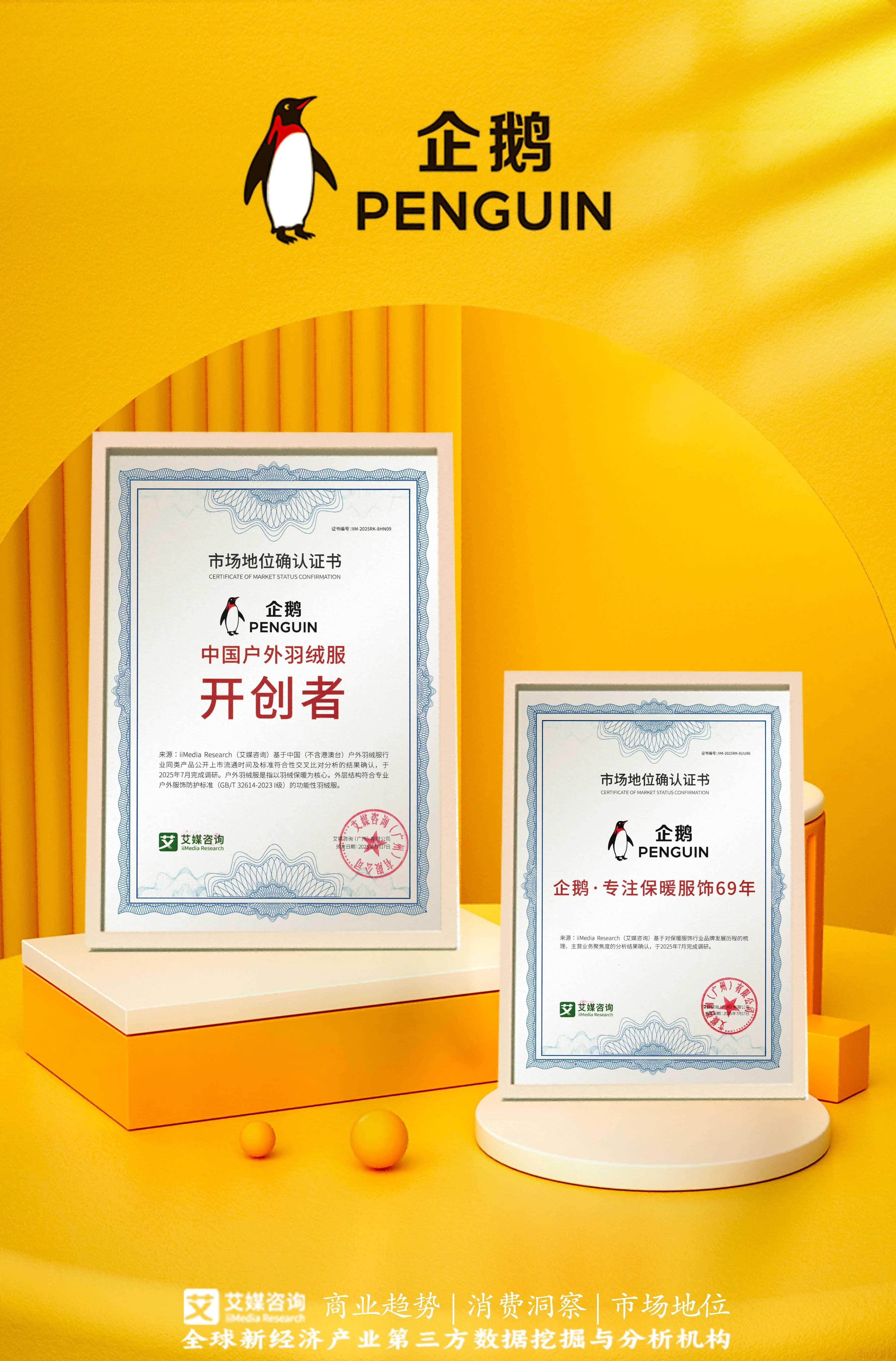 近期,企鵝獲全球領(lǐng)先的新經(jīng)濟(jì)產(chǎn)業(yè)第三方數(shù)據(jù)挖掘和分析機(jī)構(gòu)iiMedia Research(艾媒咨詢(xún))授予的“中國(guó)戶(hù)外羽絨服開(kāi)創(chuàng)者”“企鵝·專(zhuān)注保暖服飾69年”雙項(xiàng)市場(chǎng)地位確認(rèn)。