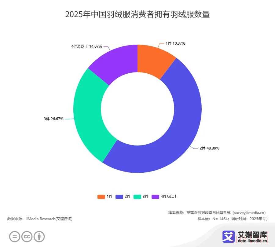 iiMedia Research(艾媒咨詢(xún))調(diào)研數(shù)據(jù)顯示,持有4件及以上的消費(fèi)者僅占14.07%,這一現(xiàn)象與羽絨服的高單價(jià)、強(qiáng)功能屬性及消費(fèi)場(chǎng)景局限性密切相關(guān),消費(fèi)者普遍傾向于通過(guò)1-2件高品質(zhì)單品滿(mǎn)足冬季基礎(chǔ)保暖需求,而非頻繁購(gòu)置。但在高緯度地區(qū)、戶(hù)外運(yùn)動(dòng)愛(ài)好者及時(shí)尚敏感型人群中,羽絨服正從“功能剛需”向“場(chǎng)景化搭配單品”升級(jí),推動(dòng)市場(chǎng)向細(xì)分化、品質(zhì)化方向發(fā)展。