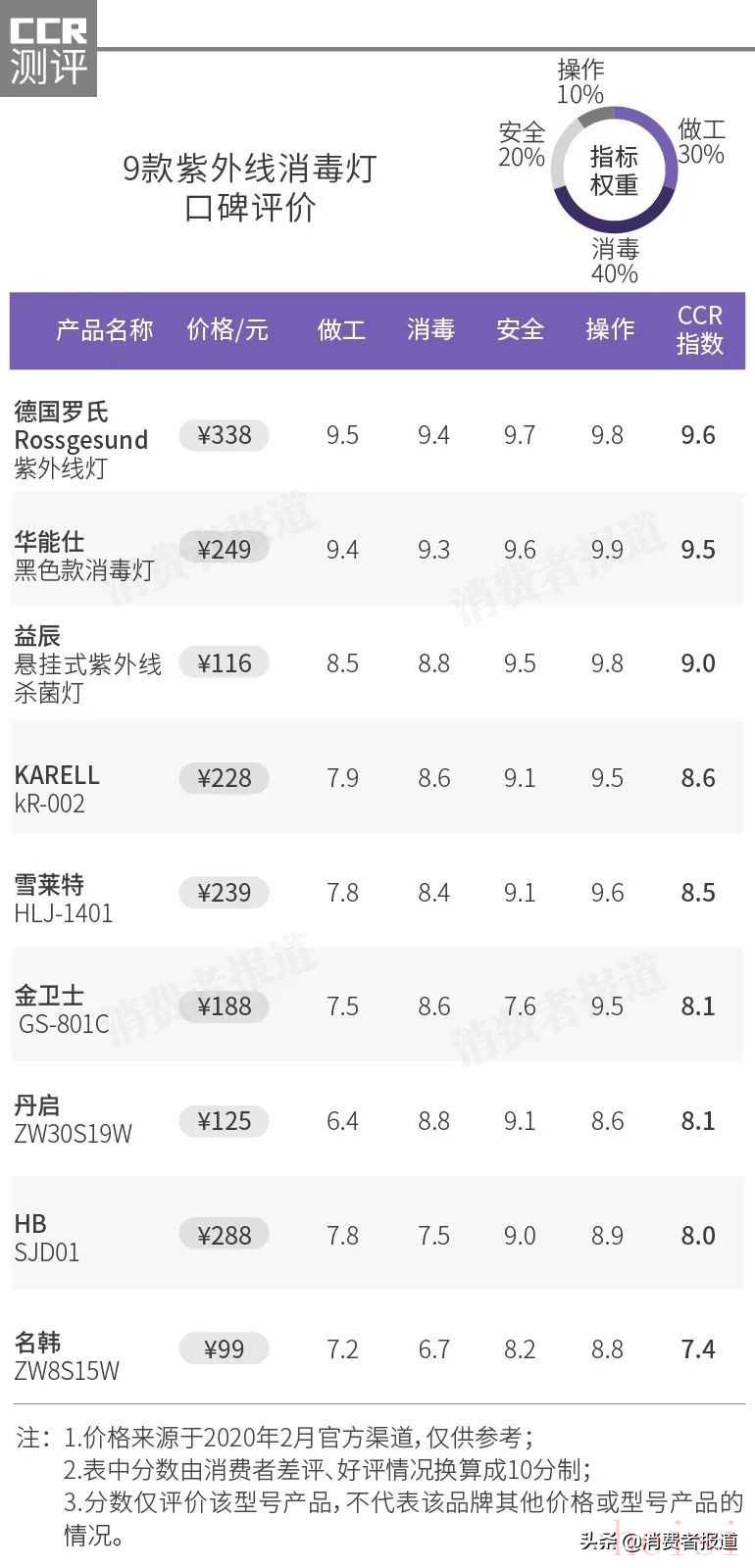 2020年2月,《消費(fèi)者報道》匯總了京東、天貓、蘇寧上熱銷的9款紫外線消毒燈的評價情況,對約1.3萬條消費(fèi)者評價數(shù)據(jù)進(jìn)行了分析和評分。