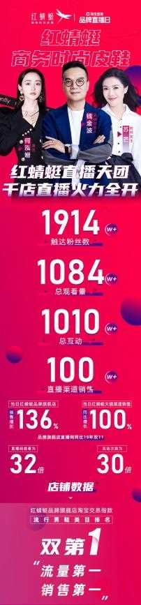 4大頻道,5大直播空間,全域千家店鋪超4000小時(shí)在線直播,全渠道7大平臺(tái)同步發(fā)聲,匯聚流量高峰,引爆商務(wù)時(shí)尚新定位,觸達(dá)粉絲數(shù)1914W+,吸引了超1084W人次的圍觀,銷售同比激增136%,紅蜻蜓品牌旗艦店問鼎天貓“流行男鞋類目”流量+銷售雙TOP。