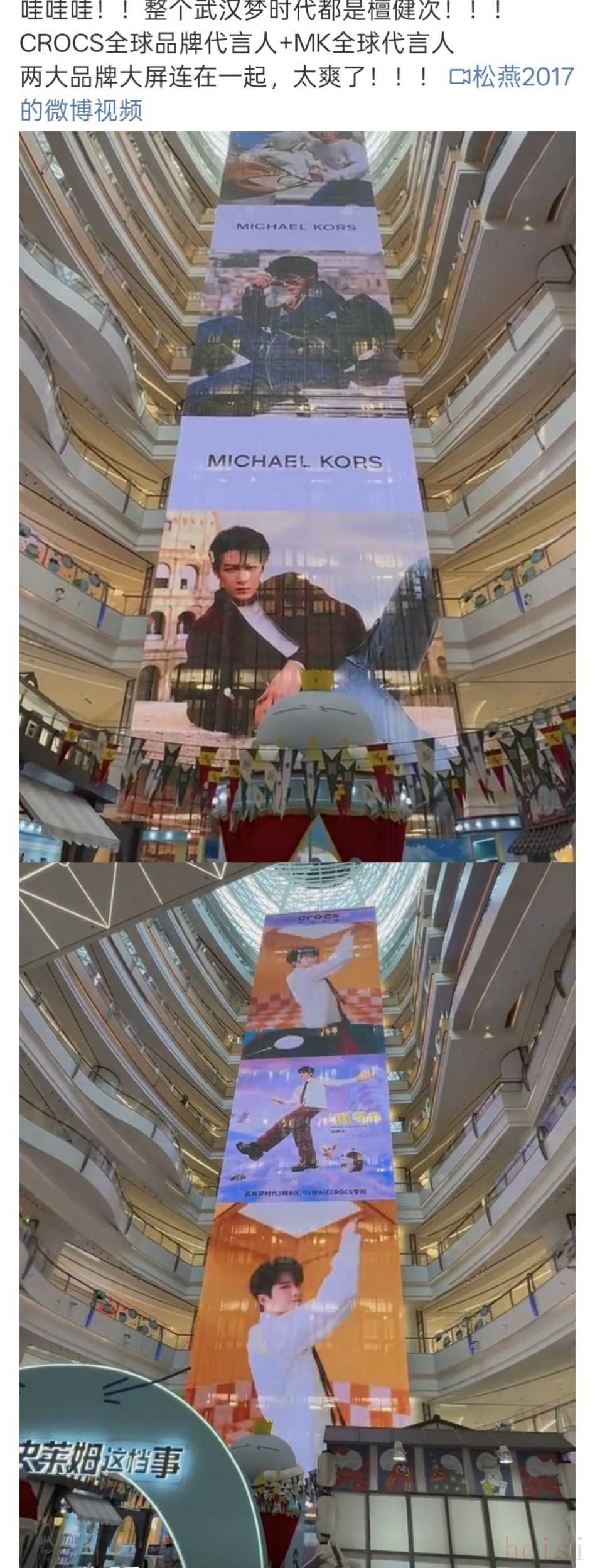 同一時間,MK新一季海報、巨幕地廣全tit國各門店同時發(fā)布,品牌內外網同步官宣,巨幕地廣,覆蓋中國各大城市核心商圈,武漢夢時代廣場甚至出現(xiàn)MK與CROCS(檀健次另一全球代言)雙品牌大屏聯(lián)動的盛況。