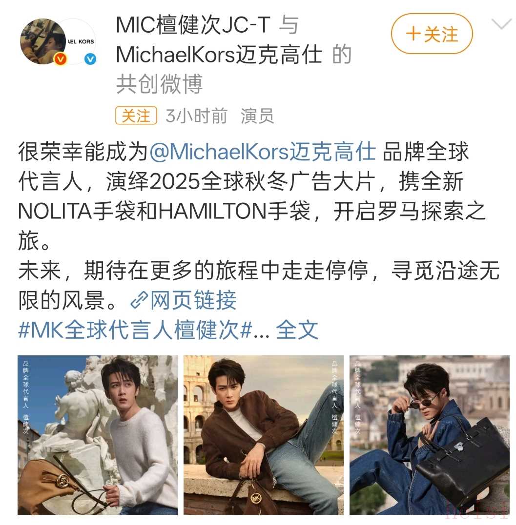 2025年9月1日10:05,Michael Kors(MK)正式官宣演員、歌手檀健次為全球品牌代言人!