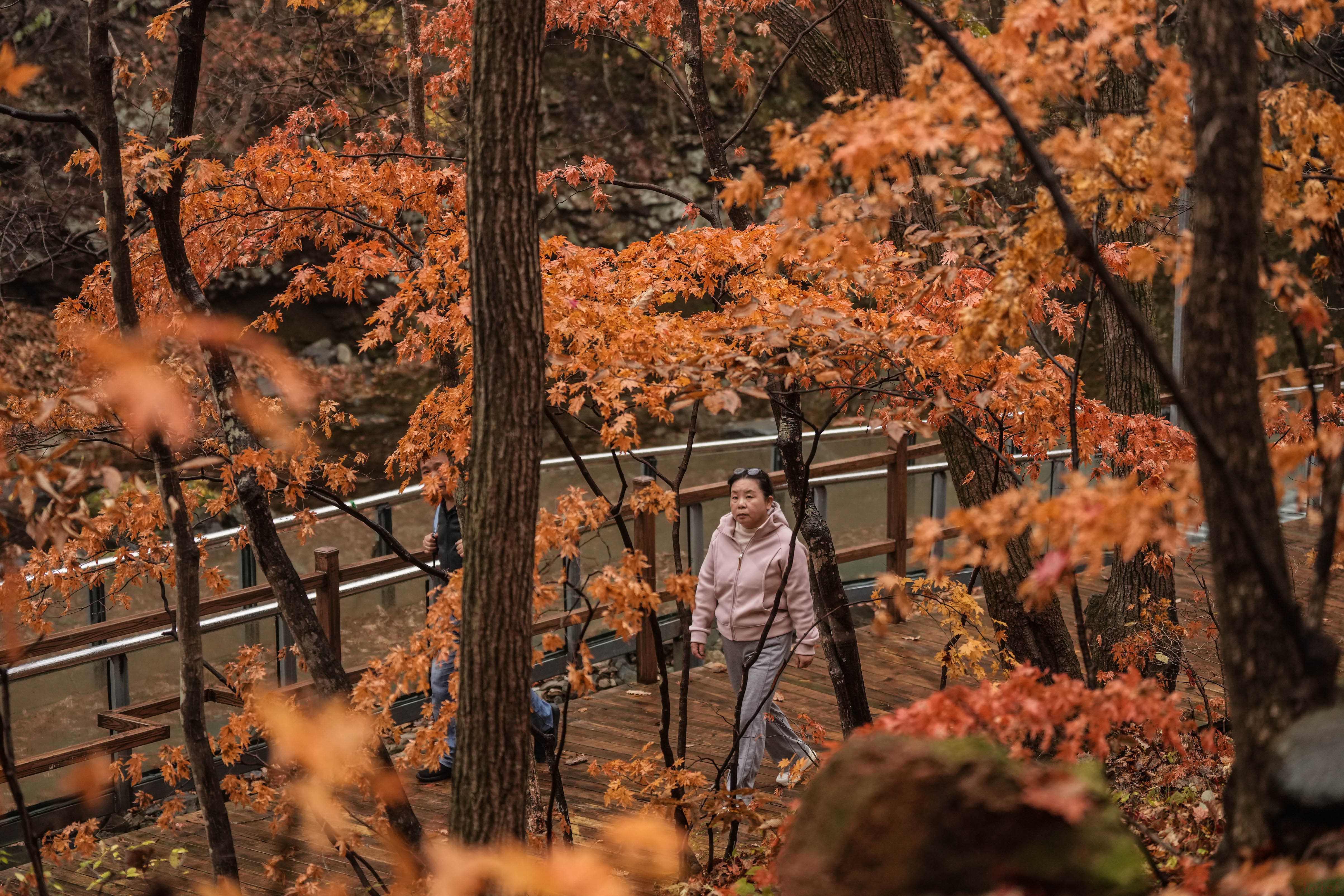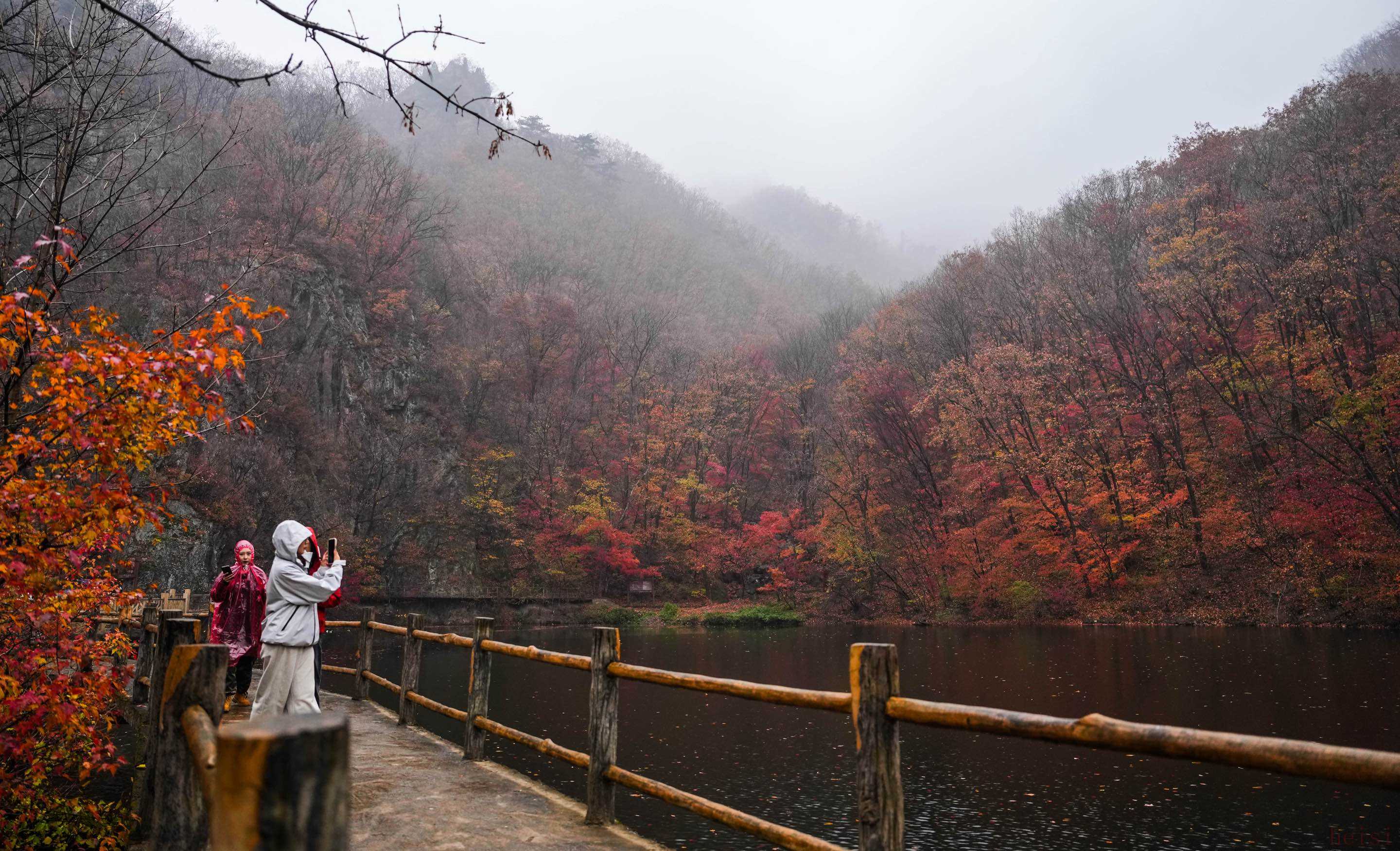 走進(jìn)秋色正濃的本溪關(guān)門山國(guó)家森林公園,小雨淅淅瀝瀝,群山之間云霧繚繞,從山尖到山腳,幾抹楓紅若隱若現(xiàn),頗有一番水墨韻味。