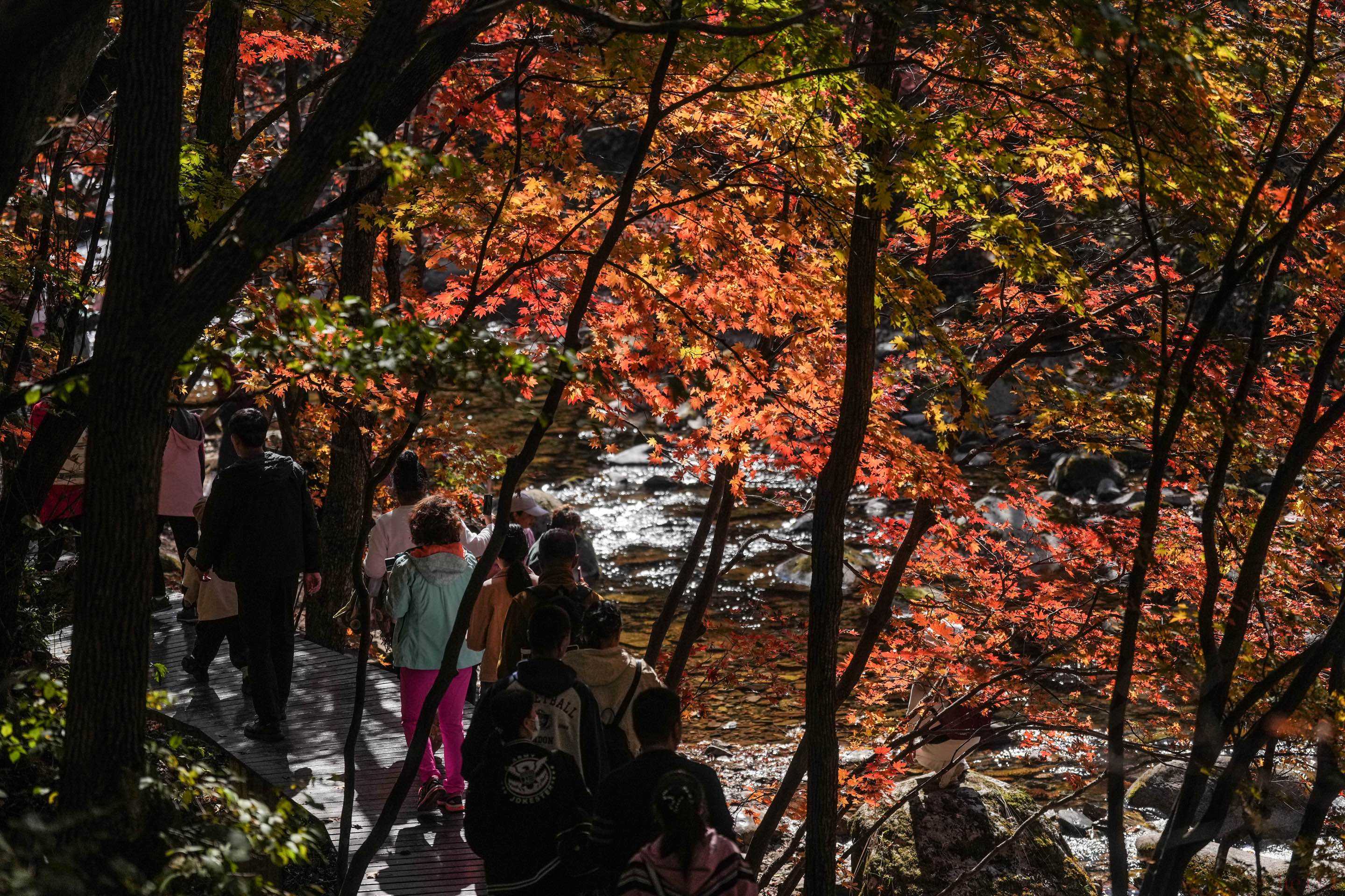一邊賞景,一邊徒步,置身?xiàng)鳂鋽?shù)量占到樹木總數(shù)六成的關(guān)門山內(nèi),人們不僅醉心于負(fù)氧離子豐富的自然環(huán)境,更是充滿了對(duì)于秋天無(wú)限的遐想。難怪來(lái)自上海旅行團(tuán)的游客情不自禁地紛紛贊嘆:“太美了,像是在畫里一樣?!?/p>