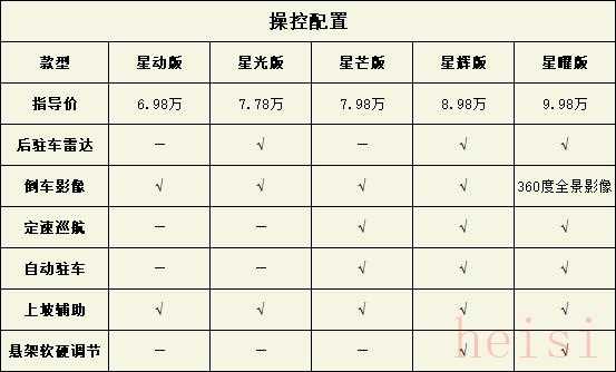 輔助/操控配置上,星辰也學(xué)起了一些日系車,手動(dòng)擋和自動(dòng)擋的入門車型均沒有后駐車?yán)走_(dá),但倒車影像是入門就有,上坡輔助功能也是標(biāo)配。其它的差異,就是從星芒版開始,即所有自動(dòng)擋車型都帶有定速續(xù)航、自動(dòng)駐車功能。而星輝版和星曜版則多了懸架軟硬調(diào)節(jié)功能。此外,我試駕的星曜版車型還多了360度全景影像。