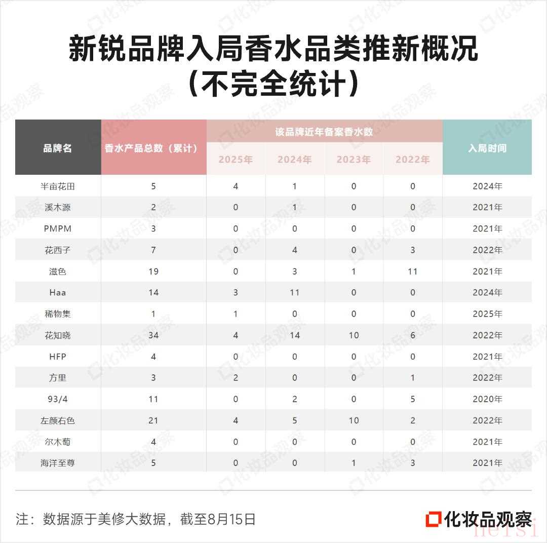 從時(shí)間點(diǎn)來(lái)看,溪木源、PMPM、滋色、HFP、爾木萄、海洋至尊等6個(gè)品牌,均于2021年推出了首款香水產(chǎn)品;布局最早的則是新銳護(hù)膚品牌93/4,2020年就推出了兩款香水,如今已累計(jì)推出了11款香水;到了2022年,花西子、花知曉、左顏右色、方里4個(gè)品牌又相繼開(kāi)拓了香氛線。