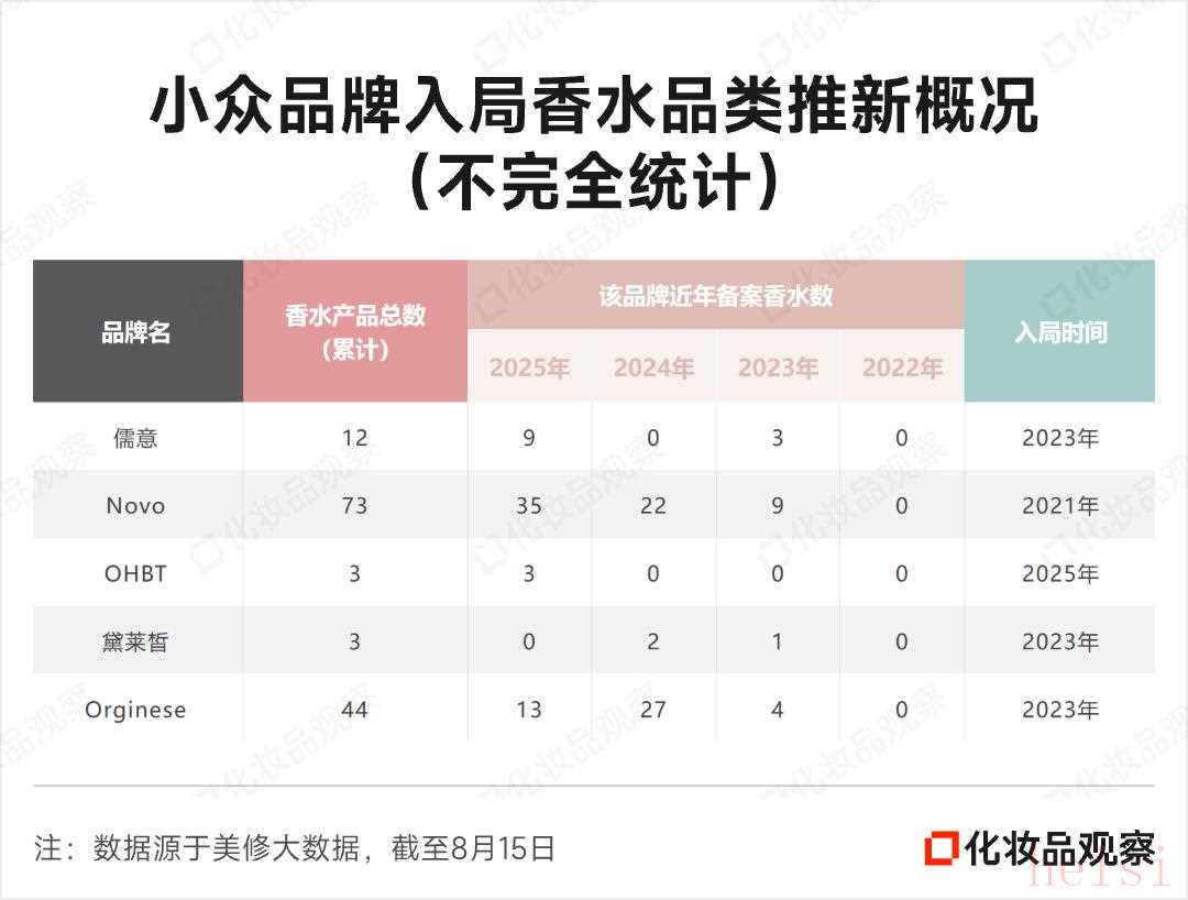 NOVO、OHBT、黛萊皙、Orginese等品牌,紛紛于2023年推出相關(guān)產(chǎn)品,其中香水?dāng)?shù)最多的是彩妝品牌NOVO,已累計(jì)推出了73款香水。