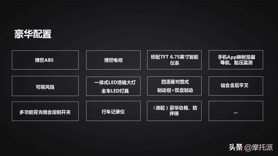 其他配置方面,RG3標(biāo)配博世雙通道ABS系統(tǒng)、博世電噴,前制動(dòng)采用雙浮動(dòng)盤配對(duì)四卡鉗,鋁合金搖臂及其他多處鋁合金部件;標(biāo)配TFT 6.75英寸智能儀表,具有手機(jī)App映射投屏功能,風(fēng)擋采用可調(diào)式設(shè)計(jì),標(biāo)配胎壓監(jiān)測(cè)、一體式LED透鏡大燈、全車LED燈具等。