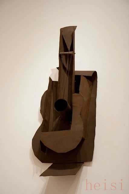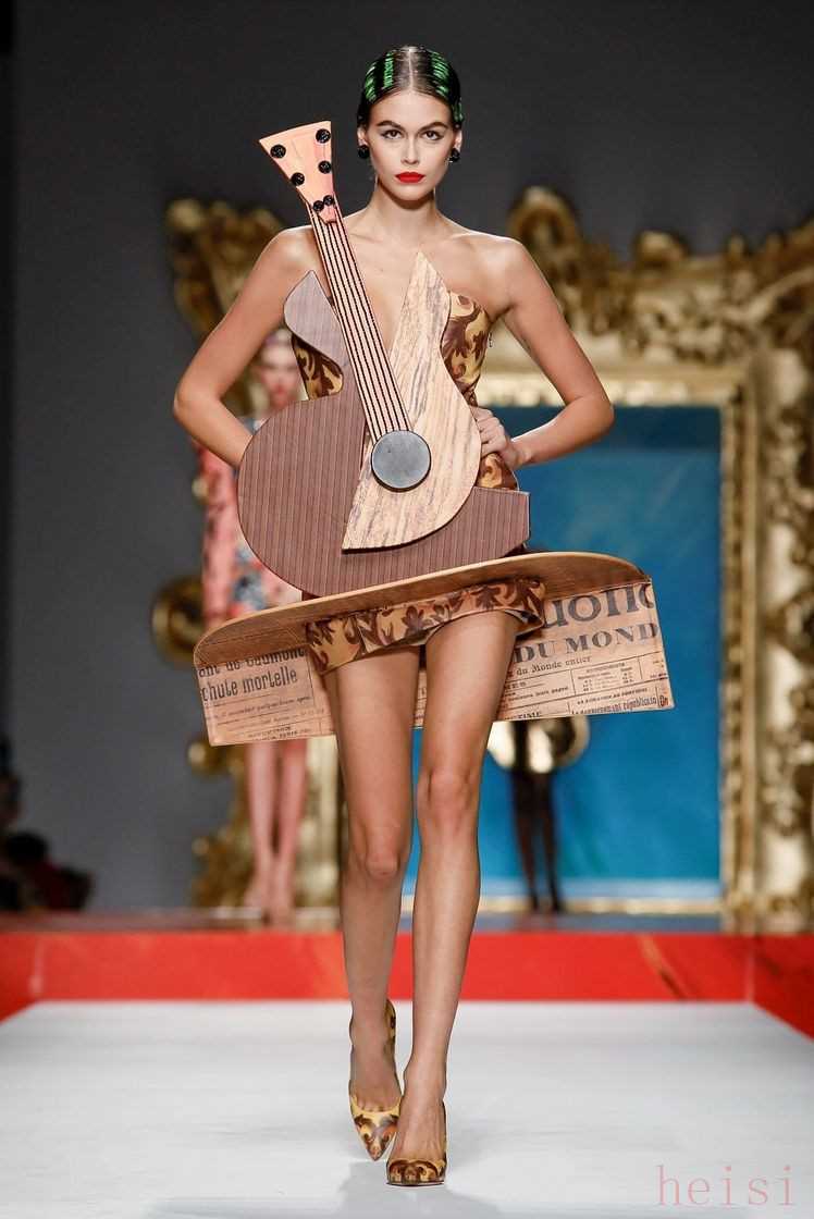 而秀場中多次出現(xiàn)的吉他元素,特別是Kaia Gerber上身的立體吉他連衣裙,連木質(zhì)結(jié)構(gòu)般的紋理都致敬了畢加索在1912年制作的雕塑作品吉他。當(dāng)時的傳統(tǒng)雕塑作品多以人為主角,畢加索以吉他為主題打破了這種傳統(tǒng)。而Jeremy Scott對于吉他元素的反復(fù)使用不也正意味著他從冷靜秩序時尚圈的一種離經(jīng)叛道嗎?