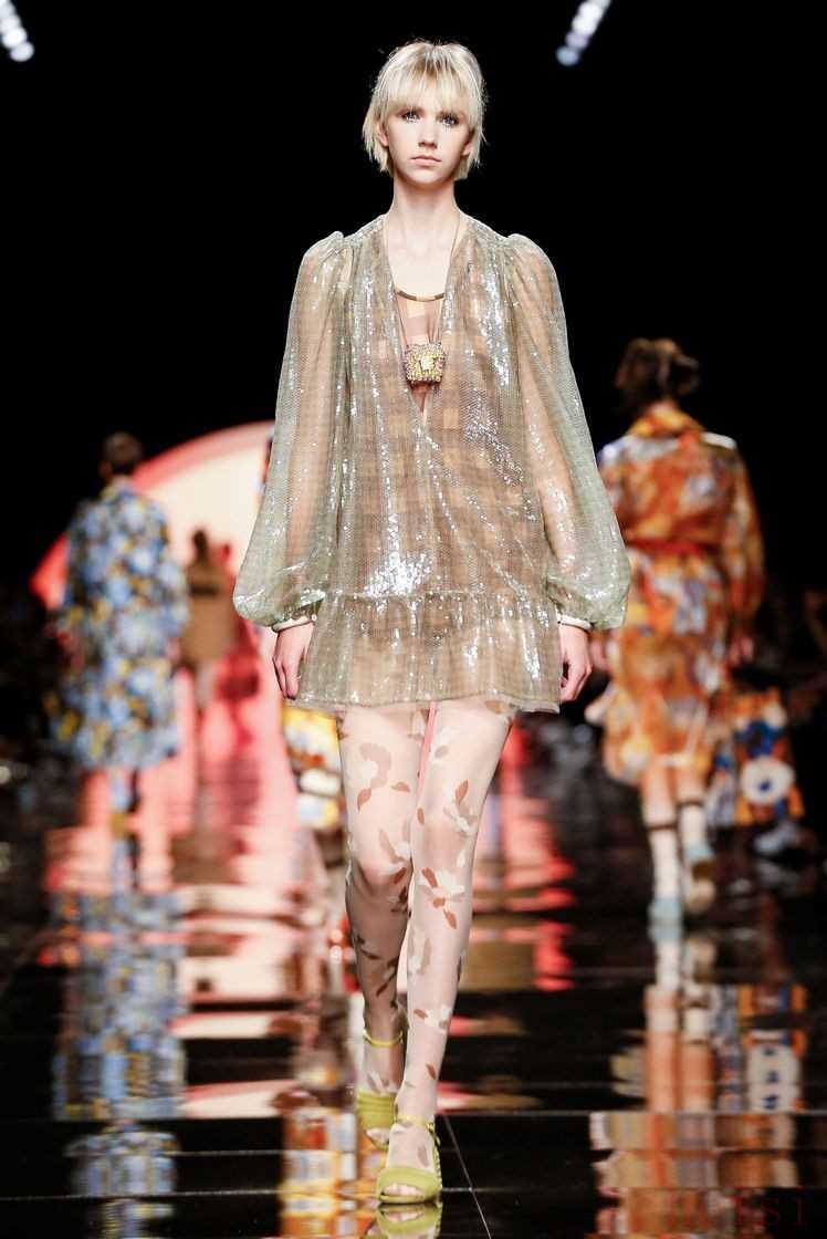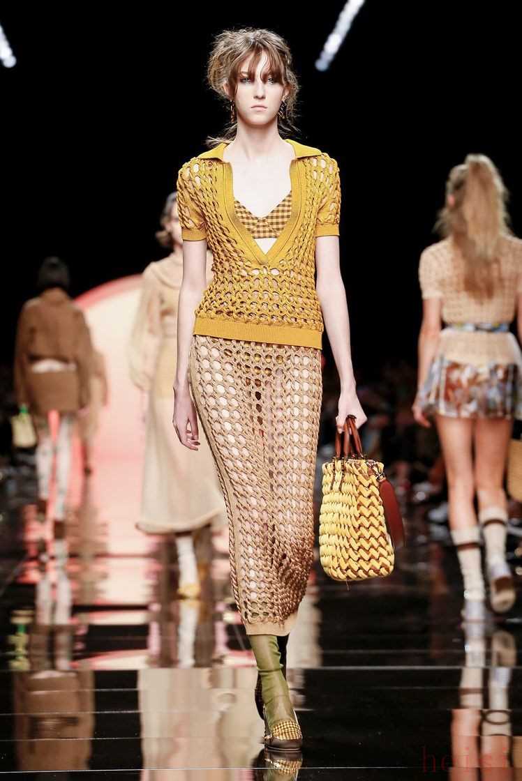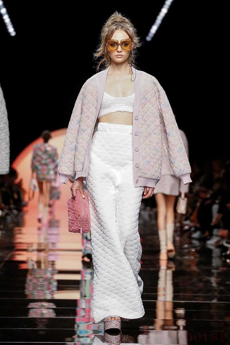 更讓人為之心動的是那些覆上了一層光芒的格紋面料,在行走間流光溢彩。這就是以精妙絕倫工藝立足的Fendi所帶給我們的驚喜,無論是極簡的V字領(lǐng)上衣還是透明短袖罩衫,都變得更加迷離和夢幻。