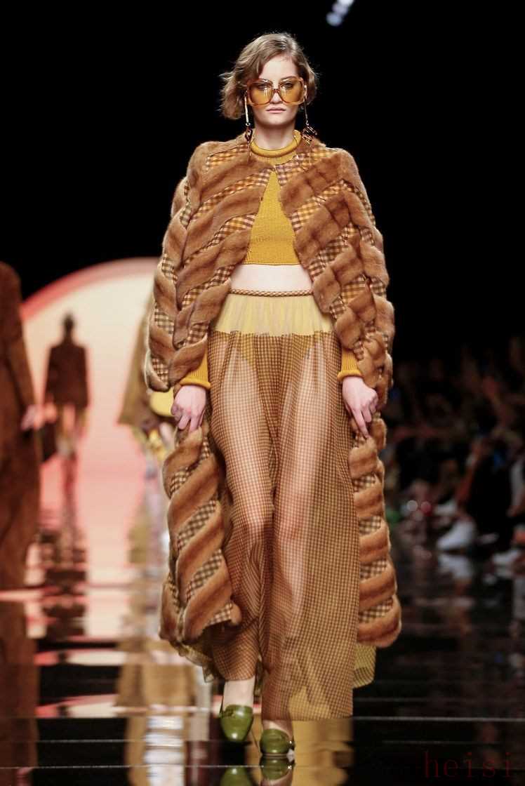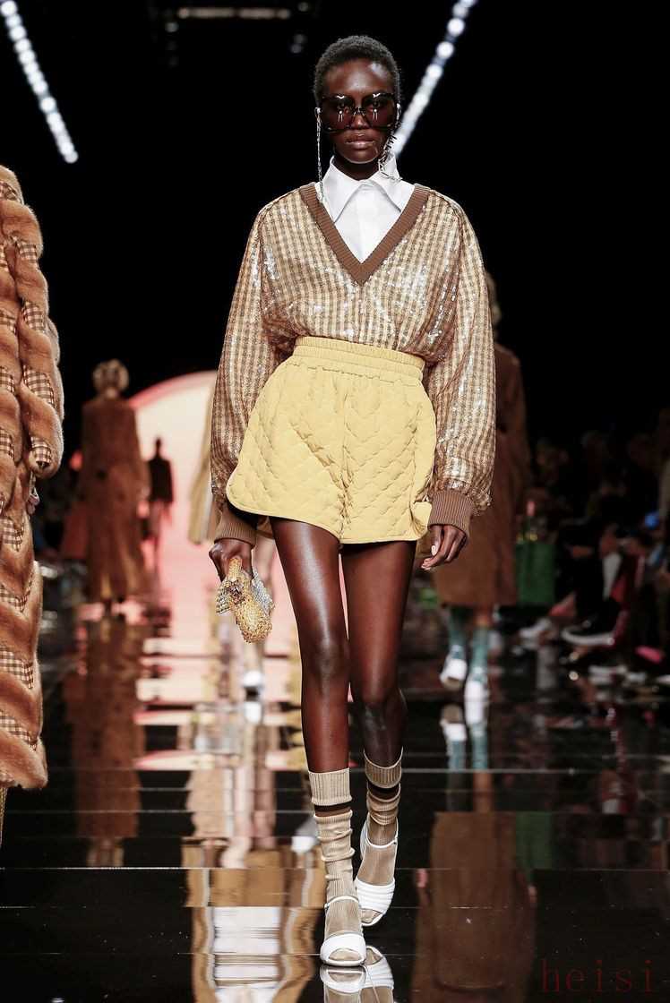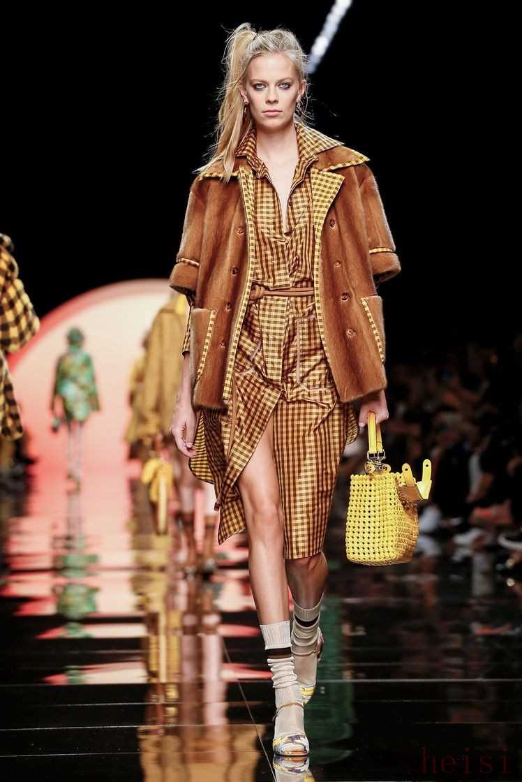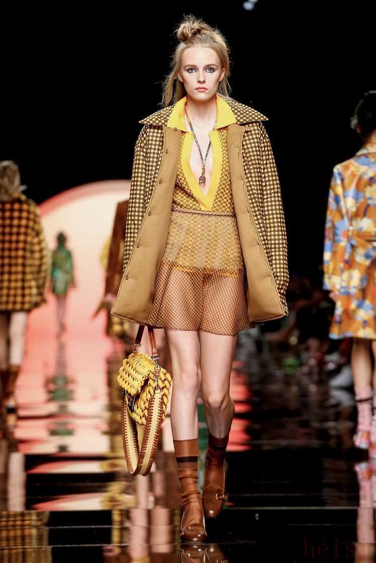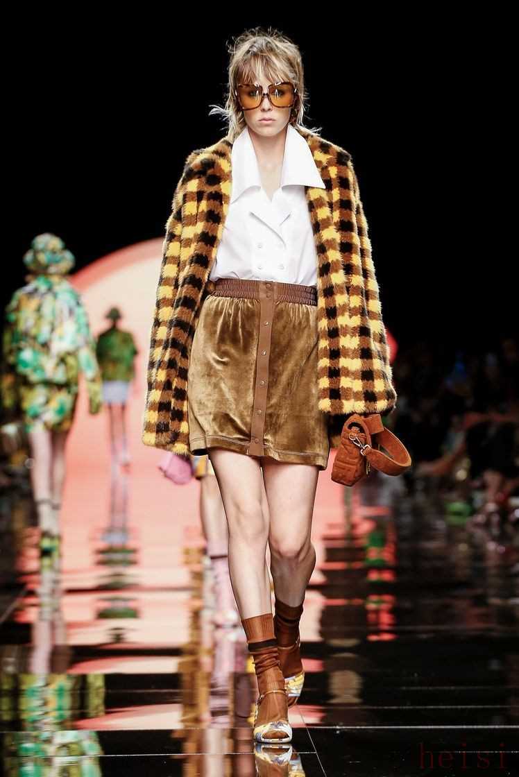在印花之外,F(xiàn)endi經(jīng)典的格紋元素再次回歸,自帶天然氣息的維希格紋出現(xiàn)在皮草外套、夾克、短褲甚至內(nèi)襯上,混搭著絲絨半裙和尖領(lǐng)襯衫,整體造型復(fù)古又有趣。