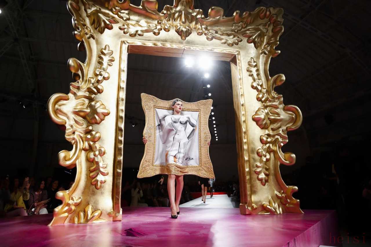 大秀開始前,Moschino 就做足了預(yù)熱。在預(yù)告視頻里,由Moschino金色字體扭曲變形成金色畫框,就吊足了胃口。