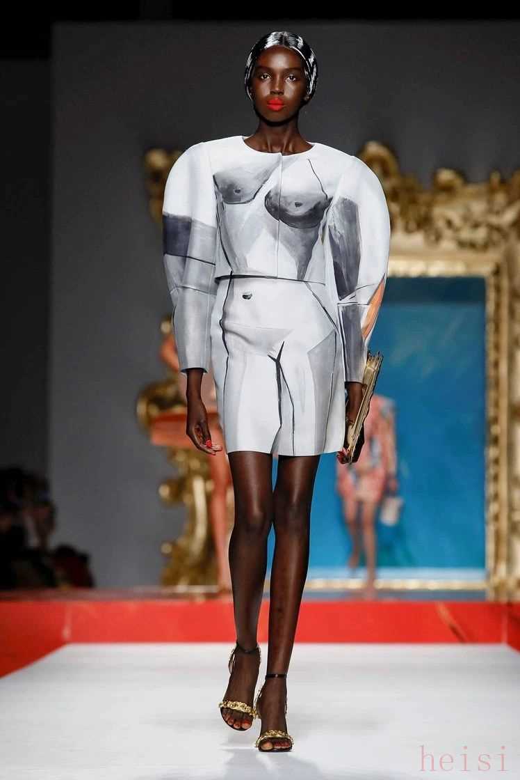 而畢加索早期的木炭畫和素描在這一季中也得到了更加直觀的體現(xiàn)。無論是吸爆眼球的帶著夸張而龐大的畫框直接上陣的“裸體”女人,還是絲毫不打破整體性的圖像印花套裝,服裝上的軀體部位和線條都和模特完美匹配,玩心大發(fā)地來了一場迷惑的視錯覺游戲。