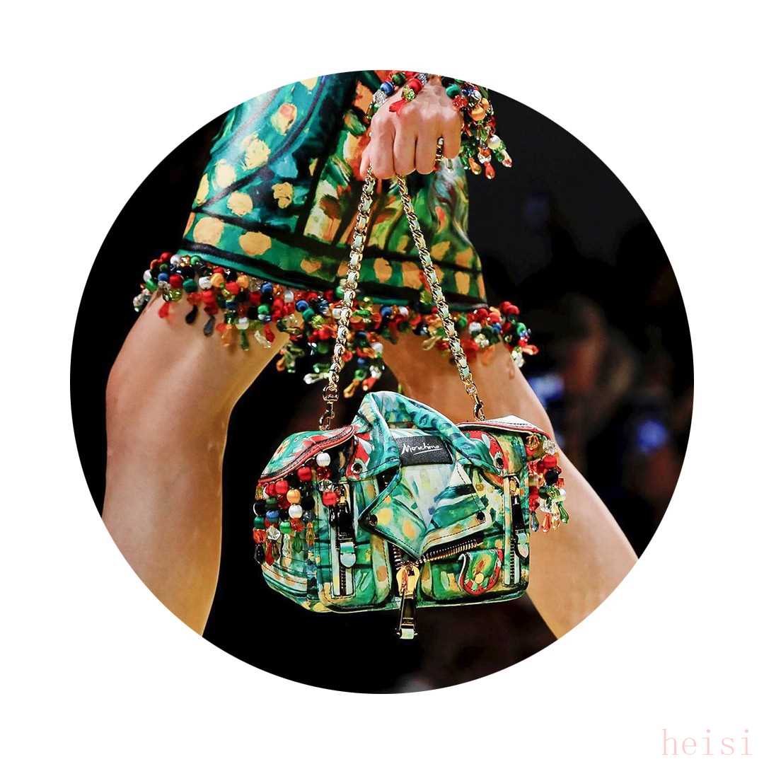 銜草的和平鴿、折疊的皮夾克、金光閃閃的相框,在Moschino這兒所有的一切都可以成為手袋,想象的桎梏早已被打破。