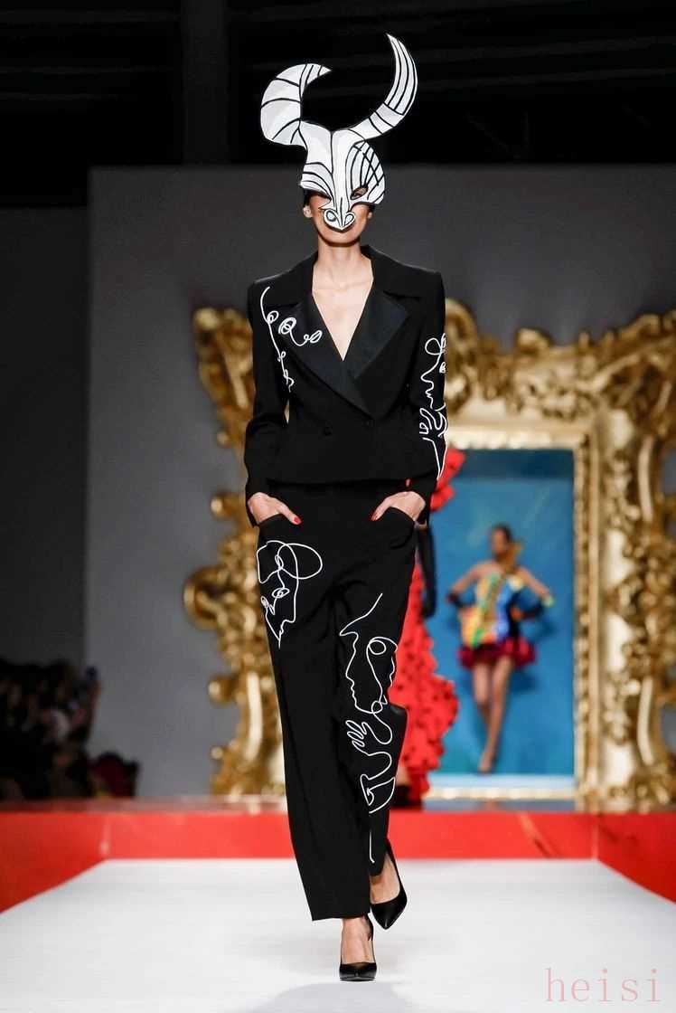 而這一身由線條裝飾的黑色西服套裝,抽象的人臉和扭曲的人體部位線條在純黑的底色下更具戲劇效果,模特頭上的仿佛半邊牛頭和半邊羊頭拼接而成的面具也頗有畢加索名畫《格爾尼卡》的意蘊。