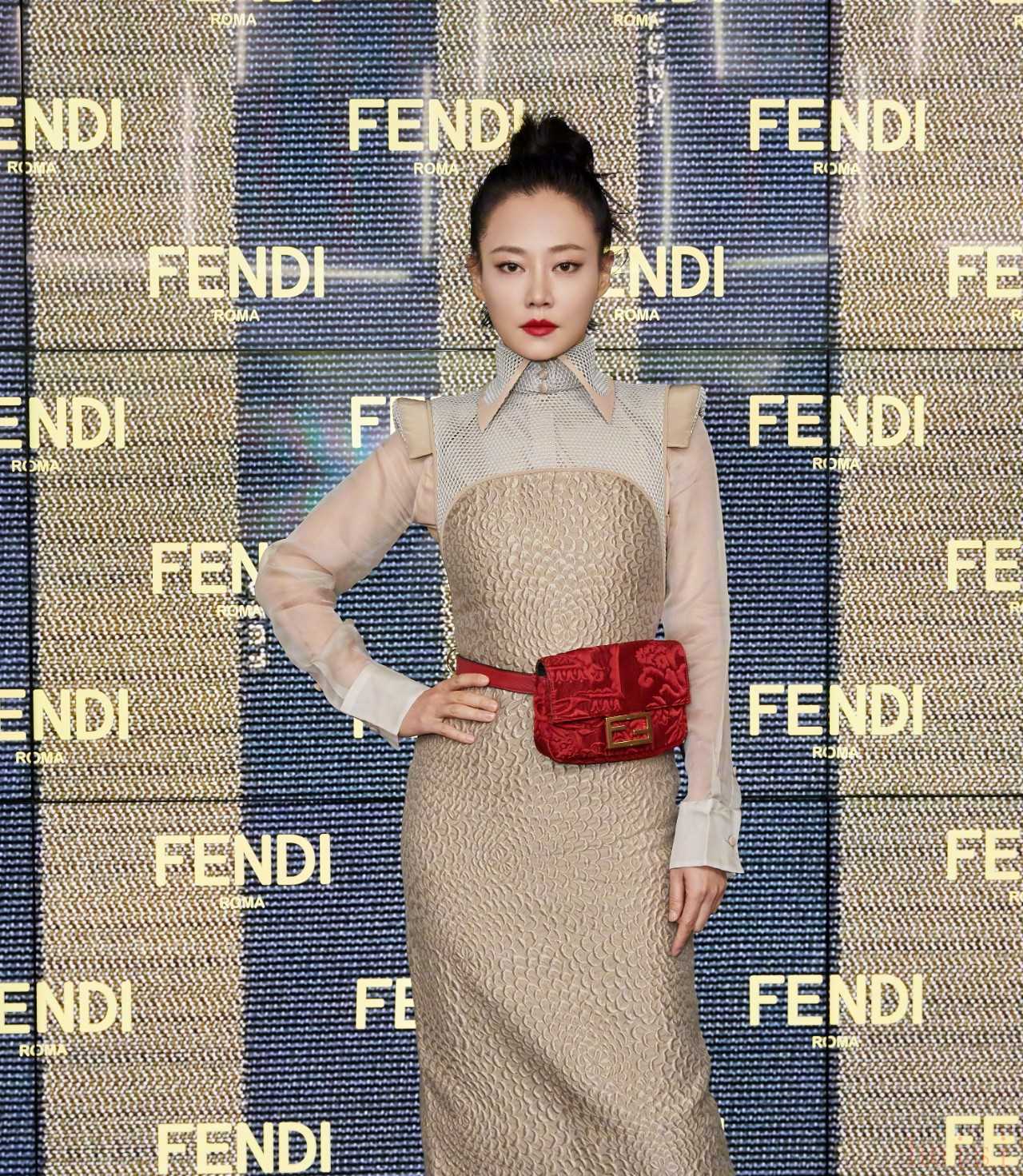 Baguette手袋大使譚卓身著Fendi 2019秋冬系列現(xiàn)身大秀現(xiàn)場,米金色暗紋連衣裙搭配暗紅色壓紋腰包,挺括的小尖領(lǐng)將這一身的干練與強大氣場都攢足了!